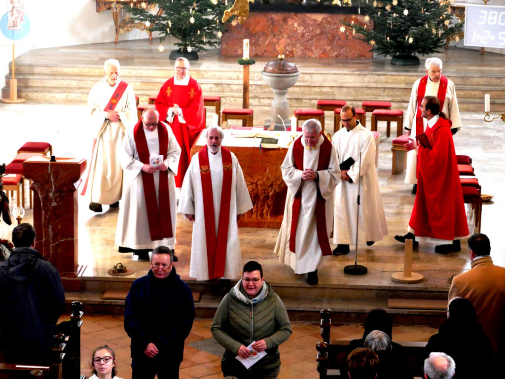 Bei der Festmesse wirkten mit (von links): Diakon-Ausbilder Erik Thouet (Heiligkreuztal), Pater Hubert Vogel, Pfarrer Thomas Bucher, Superior Ulrich Steck (Kloster Reute), Superior Konrad Werder (Salvatorianer vom Gottesberg Bad Wurzach), Pastoralreferent Benjamin Sigg (SE Leutkirch), Pfarrer Stefan Werner und Pfarrer i. R Josef Mattes. Vorne erkennt man Rolf Heber und Gemeindereferentin Sandra Weber.