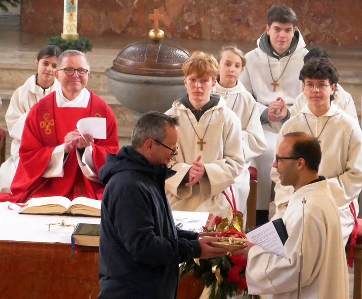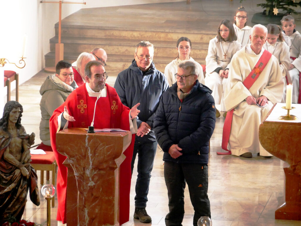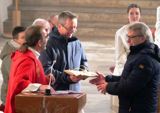 Den Priestern und Diakonen, den Minis, dem Organisten, den Lektorinnen, den Verantwortlichen für die Mesnerdienste und all den Helferinnen und Helfern dankten am Schluss des Festgottesdienstes Pfarrer Stefan Werner und der Gewählte Vorsitzende des Kirchengemeinderats Rolf Heber. Dankbaren Beifall spendeten die Gottesdienstbesucher. Der Befall war groß, als dem Festprediger Benjamin Sigg ein Präsent von der Kirchengemeinde übergeben wurde.