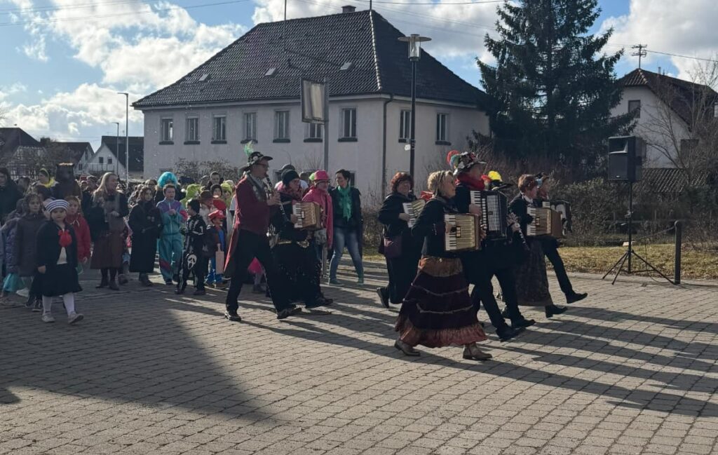 Zahlreiche bunt verkleidete Kinder und Erwachsene schlossen sich dem Zug an, der – wie jedes Jahr – vom Fanfarenzug angeführt wurde. Mit kräftigen Klängen und viel guter Laune bahnte sich die Gruppe ihren Weg durch die Straßen bis zum Dorfplatz. Große Begeisterung lösten die Kanoniere aus, die mit ihrer Narrenrakete wieder reichlich Süßigkeiten und Konfetti in die Menge schossen.