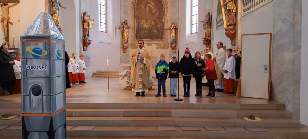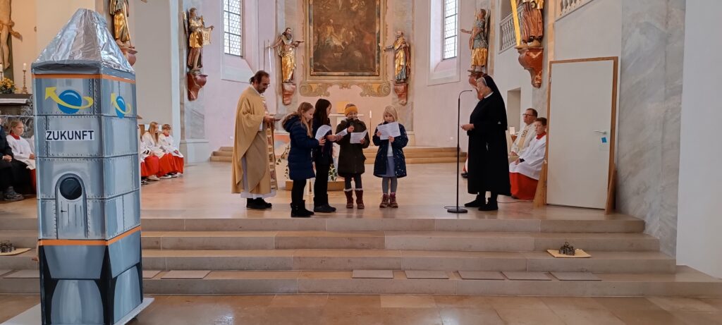 Es rumpelte in der Kirche zu Reute, als eine gebastelte große Zeitmaschine die Kinder 600 Jahre zurück versetzte. Die Gute Beth (in Gestalt von Schwester Birgitta) trat zu einer Türe ein und beantwortete viele neugierige Fragen aus dem Religionsunterricht der Kinder. Themen wie „Hattest du auch Freunde; wie konntest du zwöllf Jahre ohne etwas zu essen leben; war es nicht schrecklich, wenn aus deinen Wundmalen Blut floss; konntest du auch lachen und glücklich sein, beantwortete die Gute Beth auf schwäbisch mit vielen Details. Zum Schluss kam der Satz: „Der Glaube an Gott ist der Schlüssel zum Leben.“