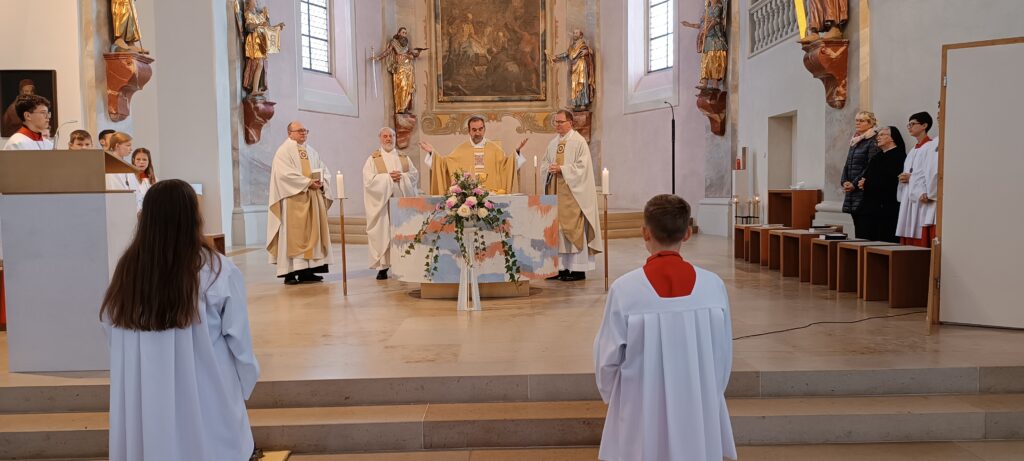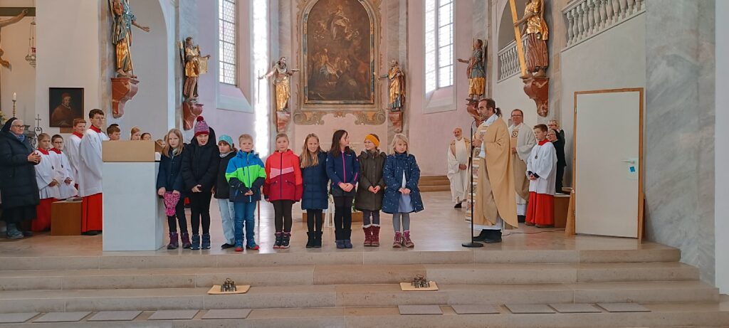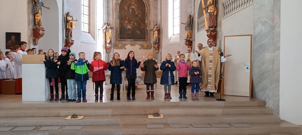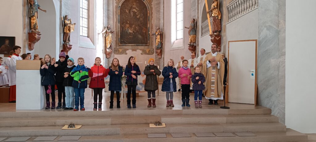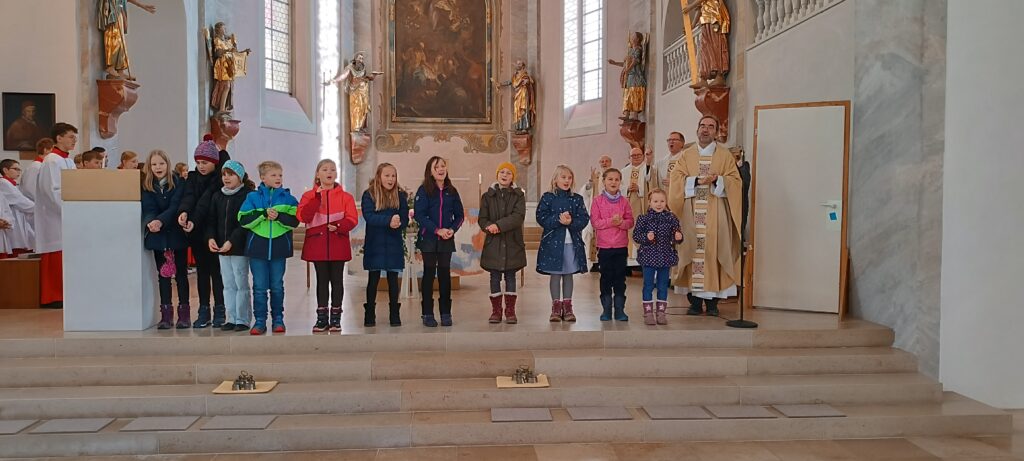 Neben dem Auftritt der Kommunionkinder sprach Pfarrer Stefan Werner die fünf Pilger-Samstage der Seelsorgeeinheit von Juli bis November an. Besuchte Orte der Menschlichkeit waren für die Wallfahrer die Solidarische Gemeinde Reute-Gaisbeuren, die Suppenküche, die kirchliche Kleiderstube, der Menschenrechtsverein Global, das Integrationszentrum Weingarten, die Bahnhofsmission sowie die Trauerpastoral Bad Waldsee.
