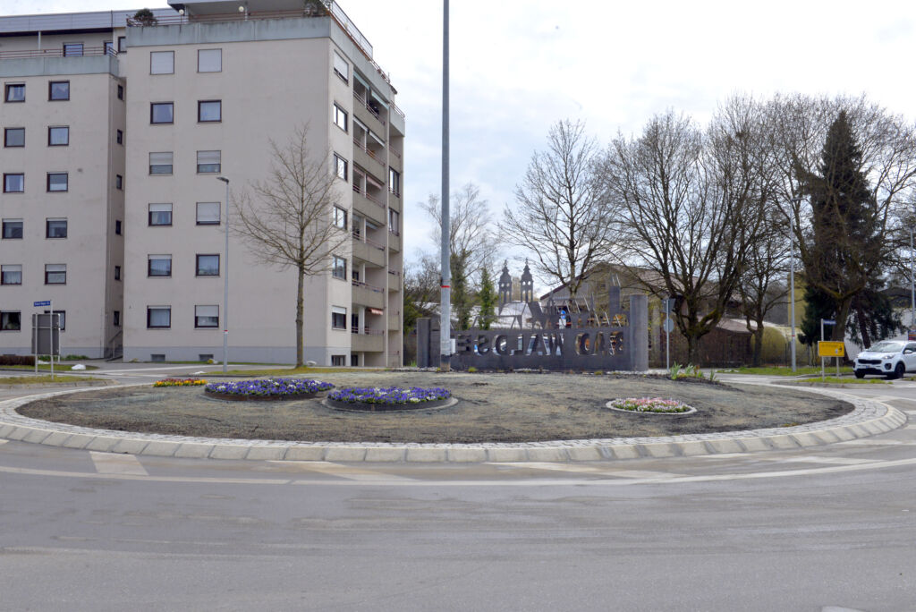 Der Frauenbergkreisel mit neuer Anpflanzung und dem Bad Waldsee-Schriftzug (Blick stadtauswärts). Foto: Brigitte Göppel