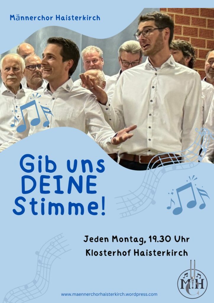 Der Chor mit über 40 Sängern zwischen 35 und 80 freut sich nach wie vor über jeden neuen Sänger, der Lust hat auf das Singen in Gemeinschaft. Als Voraussetzung genügt allein die Freude am Singen. Die Proben sind immer montags um 19.30 Uhr im Klosterhof Haisterkirch. Eine Anmeldung ist nicht erforderlich, ein unverbindliches Dabeisein jederzeit möglich. Nähre Infos und Kontakt auf: www.maennerchorhaisterkirch.wordpress.com.