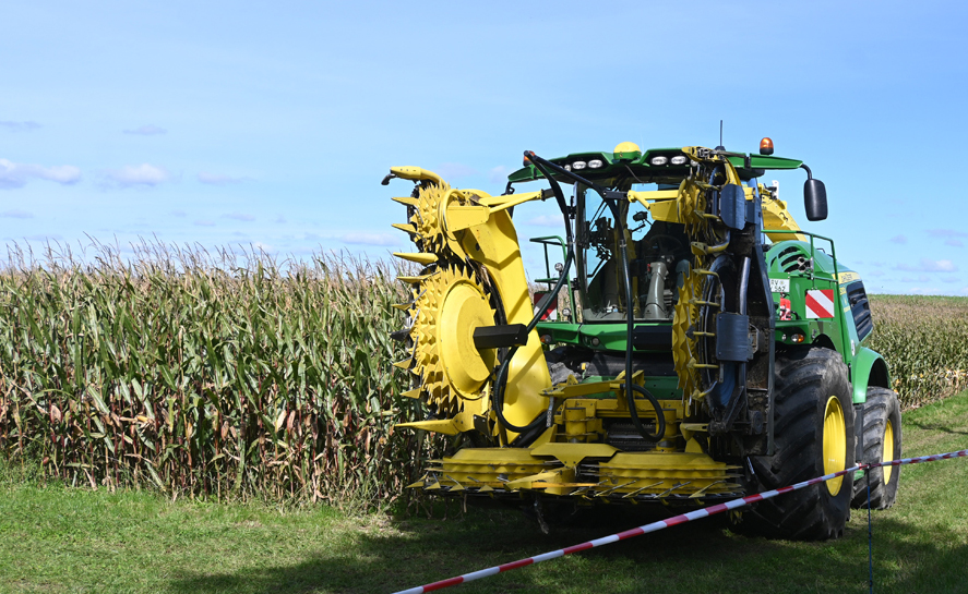 Eine riesige Maiserntemaschine steht am Feldrand. Mit sechs gefährlich aussehenden rotierenden Messerscheiben zieht sie die Maispflanzen in ihren Schlund. Hubert Schwegler (Bild), Verkaufsberater bei der BAG, kommentiert am Mikro den Ablauf. „Erst mähen wir zwei Bahnen an der Seite, damit die Maschinen wenden können. Dann können wir in genau abgemessenen Bahnen Sorte für Sorte mähen. Proben kommen dann sortenrein in das Nirs-Gerät und Sie können dann sofort die wichtigsten Inhaltstoffe der Sorten am Monitor sehen.“
