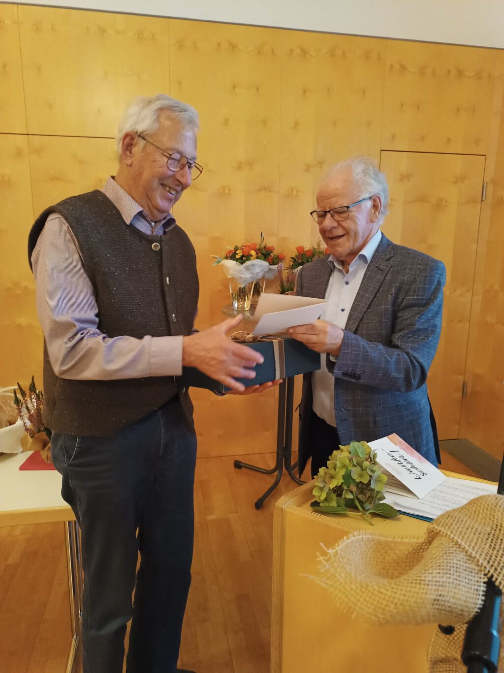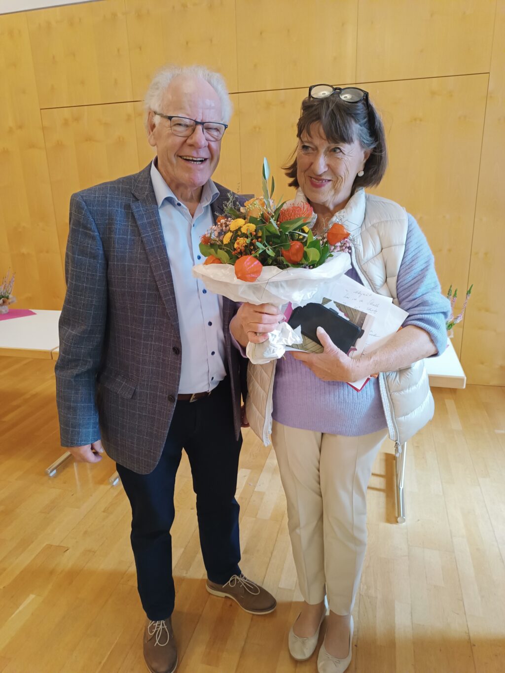 Besondere Dankeschön-Karten sowie Blumen/Wein vom Vorsitzenden bekamen Waltraud Hoch für elf Jahre höchst zuverlässige und kompetente Tätigkeit in der Anlauf- und Koordinationsstelle, Schwester Consulata vom Kloster Reute für sieben Jahre treue Dienste im Besuchsdienst, Klaus Dörrie für elf Jahre Einsatz im Fahr- und Begleitdienst. Stellvertretend für alle Ehrenamtlichen wurden Christel Teofanovic und Franz Lämmle für ihren vielfältigen und zupackenden Dienst in der Solidarischen Gemeinde geehrt. Lämmle revanchierte sich und gab mit sicherer Stimme das schwäbische Lied „D’r Gsangverei“ zum Besten. Mit schwäbischem Wurstsalat und Getränken klang der sehr harmonische Nachmittag aus.