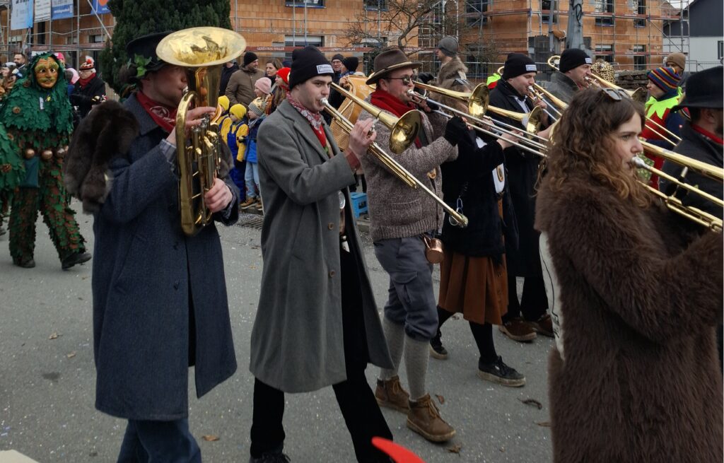 Um 13.30 Uhr setzte sich der große Narrensprung in Bewegung. Besonders die strahlenden Gesichter der Kinder im Narrensamen sorgten für Freude entlang des Weges. Zwischen den Zünften heizten zahlreiche Musikgruppen die Stimmung an. Wie es die Tradition verlangt, führten die Patenzünfte der Gilde den Umzug an.