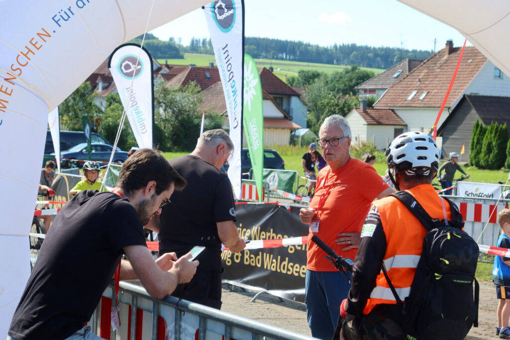 Ohne Maschinenkraft (Firma Halder) und auch ohne Manneskraft wäre das alles nicht zu bewältigen und dafür sind wir sehr dankbar, bekräftigte der Vorsitzende Franz Mosch. Dankbar ist der Verein auch für die Unterstützung durch die Ortschafts- und Stadtververwaltung. Vom Start und Ziel beim Sportzentrum Haisterkirch führt die Strecke für die älteren Teilnehmerinnen und Teilnehmer zum beliebten „Saubad-Trail“ mit den dort bestehenden, vom DAV Bad Waldsee gepflegten Trail-Stationen. Anders als im vergangenen Jahr, als es stark geregnet hatte, mussten die Kontrollposten dieses Mal keinen Regenschutz tragen. Dafür mussten sie sich mit Schleiern verhüllen, denn die Mückenplage im Waldbereich war riesig. Besonders dankbar ist die Bad Waldseer DAV-Sektion auch gegenüber dem DRK-Bereitschaftsdienst Bad Waldsee für die ganztägige Unterstützung und dem gesamten DAV-Team für Ansage, Zeitnahme, Service mit Getränken und Essen.