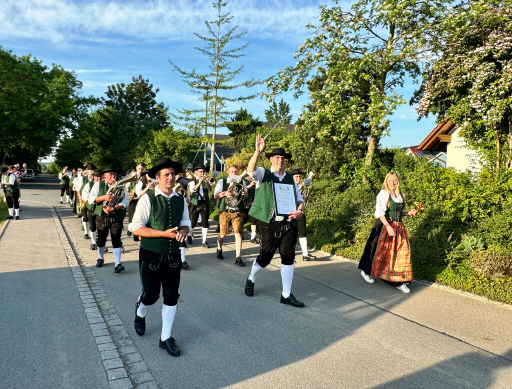 Spontan entschlossen sich die mit der Supernote belohnten Musizierenden zusammen mit ihrem musikalischen Leiter Klaus Wachter, die Freude über dieses Ergebnis auch öffentlich mit viel schmissigen Marschmusikklängen kundzutun. Nach der gemeinsamen Rückkunft wurde bei der Gemeindehalle gestartet. Von dort ging es zum Haus der glücklichen Ortsvorsteherin Rosa Eisele, die zusammen mit den Eltern von Klaus Wachter das Ergebnis feierte. Ein Stelldichein gab es dann auch in der Ortsmitte bei Klosterhof und Kirche und danach ging es zurück im Bogen durch das Unterdorf. Gefeiert wurde dann noch in kleineren und größeren Runden.
