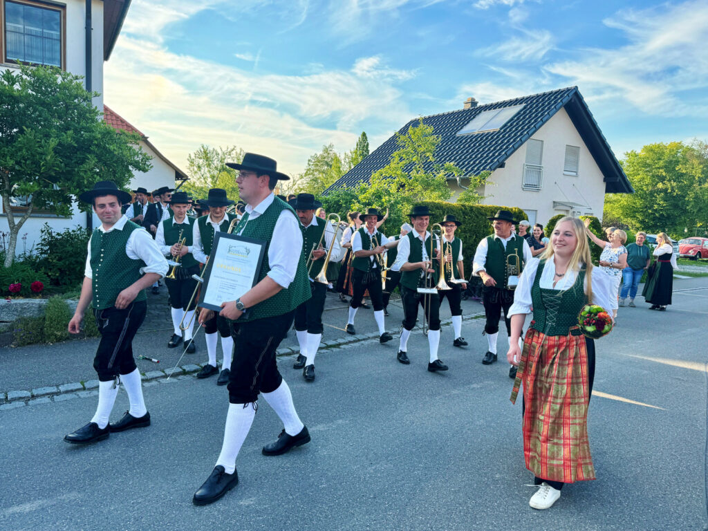 Strahlender Sonnenschein ließ die strahlenden Gesichter der Musikantinnen und Musikanten vorzüglich in der Mittelpunkt rücken. Allen voran schritt mit Dirigentenstab in einer Hand und einer Urkunde in der anderen Klaus Wachter, dessen große Freude auch an seinen Augen abzulesen war. Grund hatte er ja dazu auch, denn das wochenlange, intensive, musikalische Training mit seiner Musikantenschar hat sich voll gelohnt. Hatte Klaus Wachter noch nach der letzten Probe hier in der Gemeindehalle mit einem „Sehr gut“ beim Wertungsspiel im Rahmen des Kreisverbands-Musikfestes in Waltershofen geliebäugelt und auf eine entsprechende super Note gehofft, war das Ergebnis dann doch umwerfend. Denn schließlich bedeutete die erreichte Punktzahl von 92,8 Punkten die Bestbewertung mit „Hervorragend“.