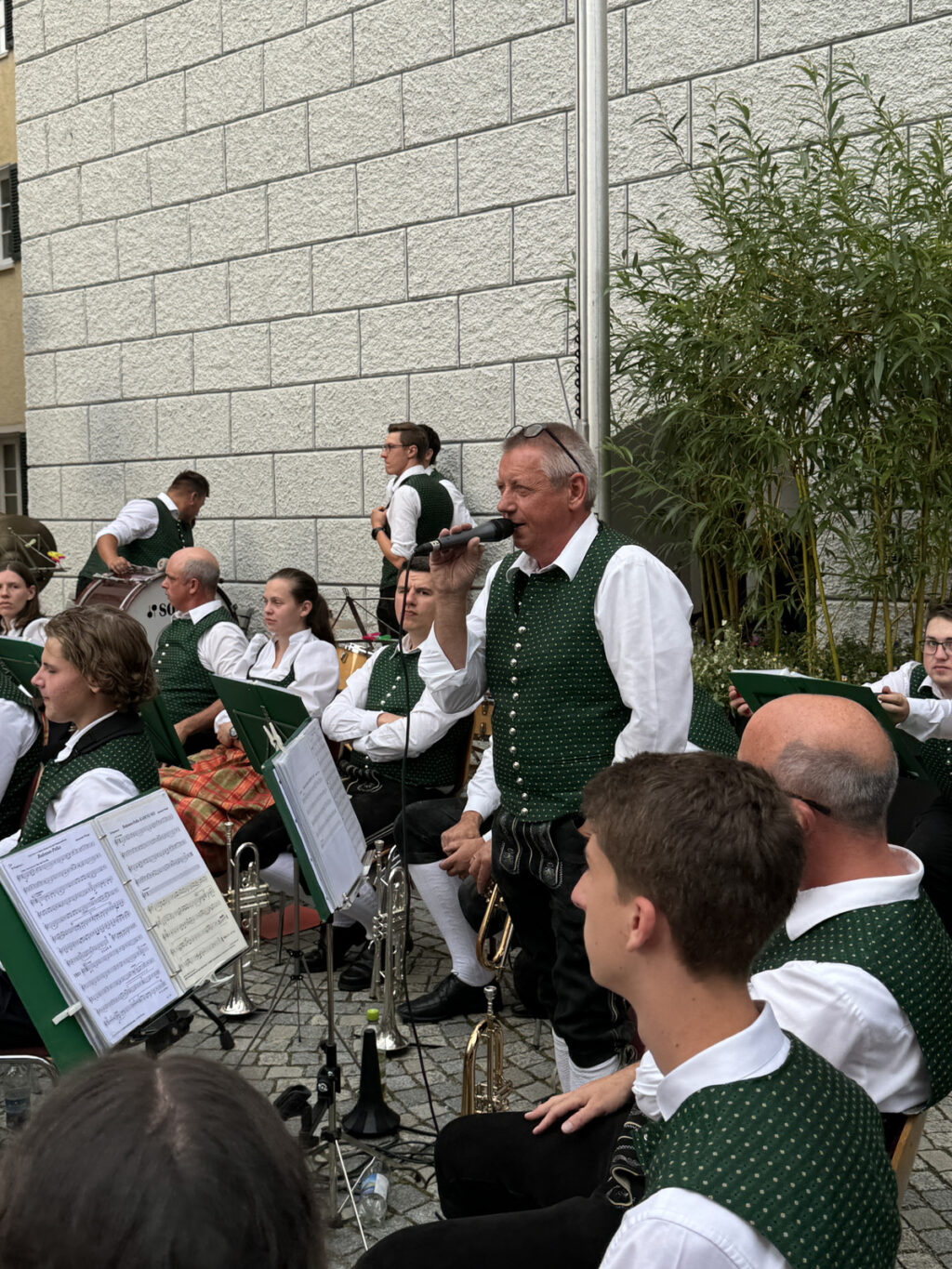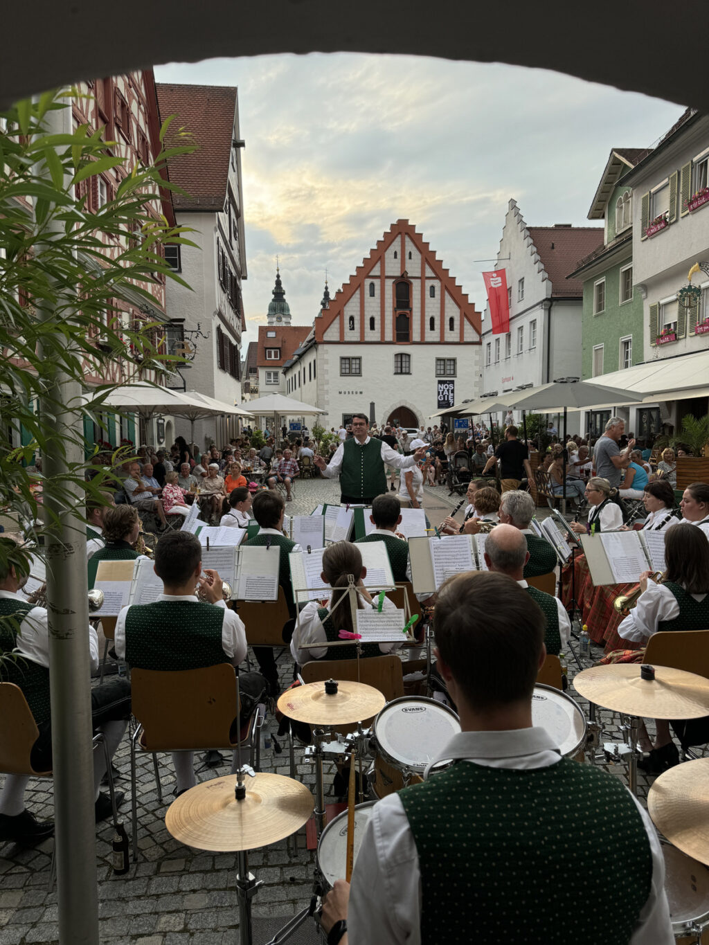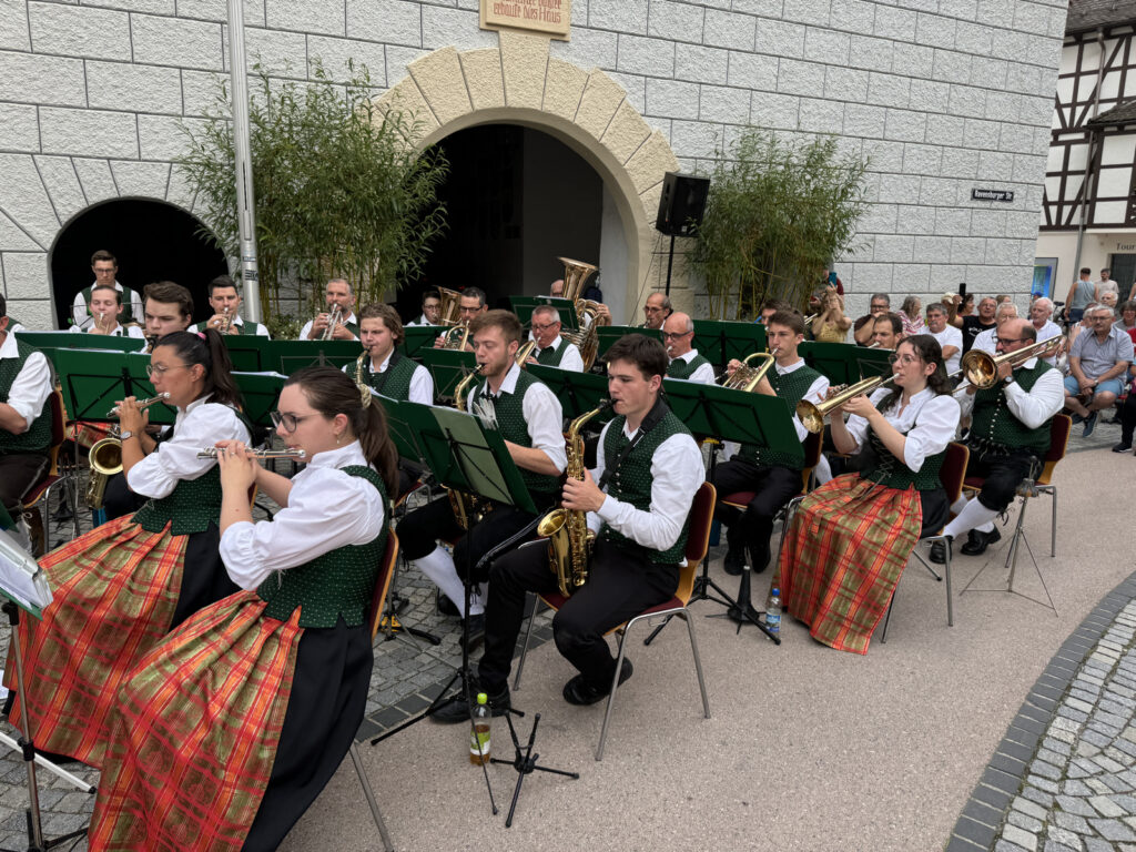Bekanntlich mussten Abendkonzerte wegen ungünstiger Wetterverhältnisse schon abgesagt werden. Die Bedingungen an diesem Abend waren für eine große Hockete geradezu ideal. Es war angenehm lauwarm. Die Sonne sandte noch ihre letzten Strahlen auf die obere Hälfte der prächtigen Rathausfassade. Hunderte von Besuchern, darunter zahlreiche Kurgäste und Fans der Haisterkircher Musikkapelle hatten sich rechtzeitig einen Platz in den Außenbereichen der naheliegenden Gaststätten gesichert.
