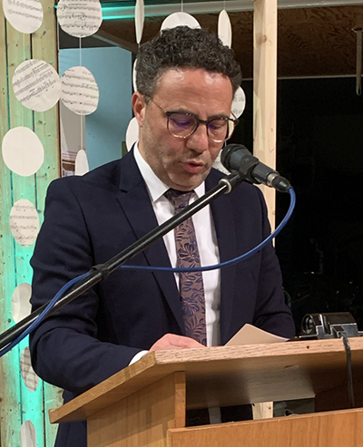 In seiner Begrüßung berichtete Vorsitzender Dominik Lander (Bild; er spielt im Bassregister) von sehr intensiver Probenarbeit, die diese spannende und außergewöhnliche Idee erst möglich machen konnte. Er hoffte, die oft nebeligen und grauen Landstriche des britischen Nordens mit der Absicht eines Frühjahrskonzerts in guten Zusammenhang zu bringen. Leonie Lerch (Trompetenregister) und Sarah Lander (Querflötenregister) teilten sich gekonnt und kompetent die Moderation durch den Konzertabend.
