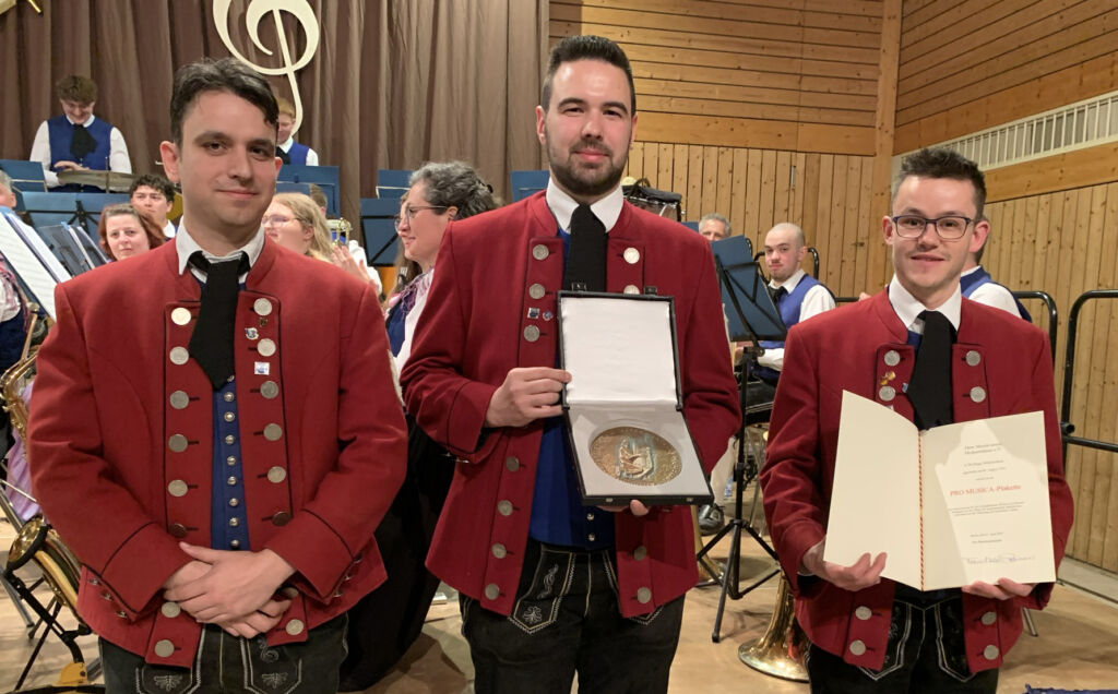 Die Vereinsführung (Lorenz Bareth, Manuel Stotz, Dominik Lander) ist mit Recht stolz auf die Pro-musica-Plakette.