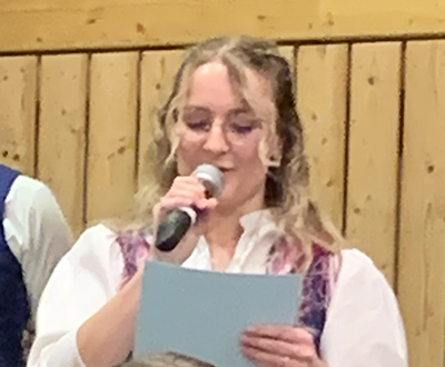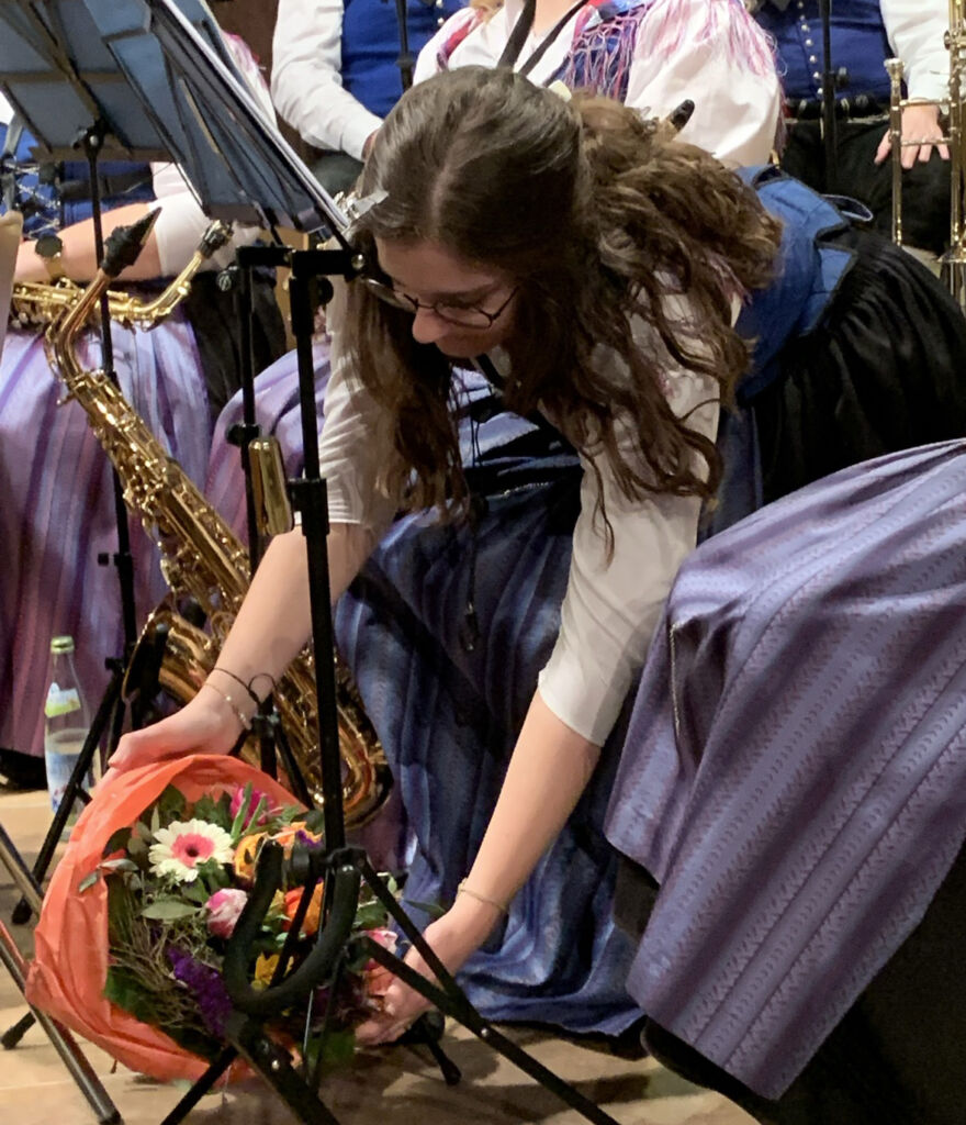 Zuvor aber dankte Dominik Lander allen, die diesen Abend ermöglicht haben, insbesondere Natalie Kiekopf, der er viel Geduld bei manchmal zähen Proben bescheinigte. Auch den beiden Moderatorinnen und dem Dekoteam unter der Leitung von Franziska Egger galt sein herzlicher Dank. Das Dekoteam hatte an verschiedenen Stellen aufwändige Arrangements aus Natursteinen, Blumen auf grünem Grund und sogar Tuch mit Schottenmuster aufgebaut. Sie alle wurden auch mit einem Blumengebinde geehrt. Auch beim vereinseigenen Serviceteam, beim Grafiker des Programmflyers und bei der Haidgauer Ortsvorsteherin Ernestina Frick für die Zurverfügungstellung der Festhalle, beim Publikum und bei allen Musikern bedankte er sich.