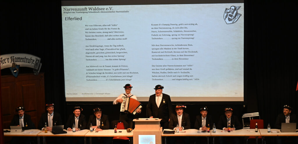 Unter den ca. 200 anwesenden Mitgliedern konnte Zunftmeister Christoph Mayer neben OB Matthias Henne die Ehrenzunftmeister Franz Mosch und Gerold Klöckler sowie den fasnetsaffinen Künstler René Auer – Schöpfer des Federle-Brunnens auf der Hochstatt – begrüßen.