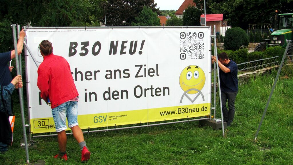 Gaisbeuren – Nach zehn Jahren hat die „Initiative B30“ in einer überparteilichen Aktion mit Vertreterinnen und Vertretern der CDU, SPD und FDP das Großbanner an der B 30 in Gaisbeuren erneuert. Mit der Botschaft „Sicher ans Ziel – Ruhe in den Orten“ spricht die Initiative Verkehrsteilnehmerinnen und Verkehrsteilnehmer sowie Anwohnerinnen und Anwohner entlang der vielbefahrenen Strecke an. Hier der Bericht der Initiative: