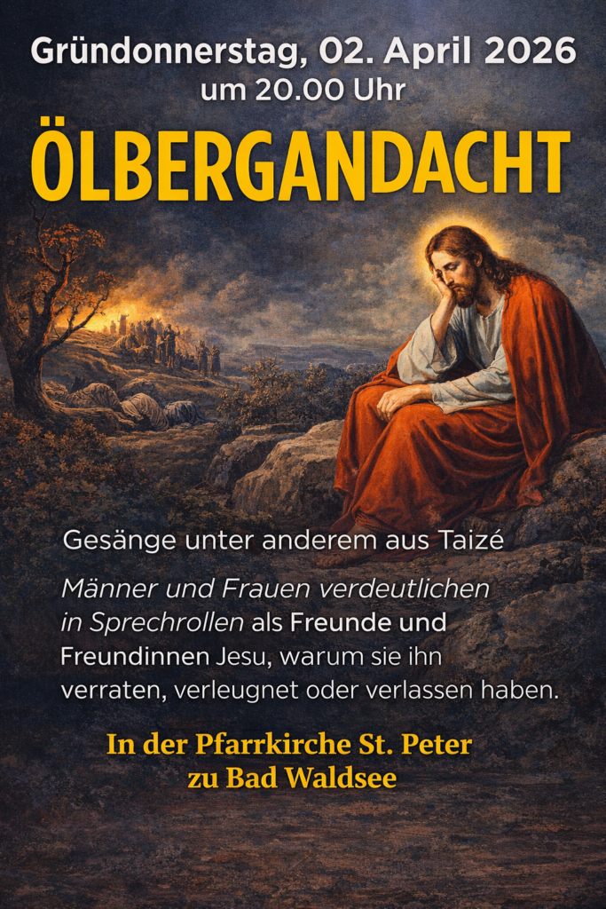 Bad Waldsee – Die Kirchengemeinde St. Peter lädt an Gründonnerstag (2. April) zu einer Ölbergandacht ein (20.00 Uhr). Siehe nachstehend eingefügtes Plakat.