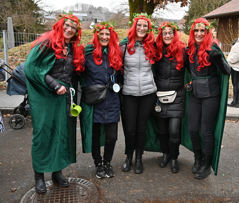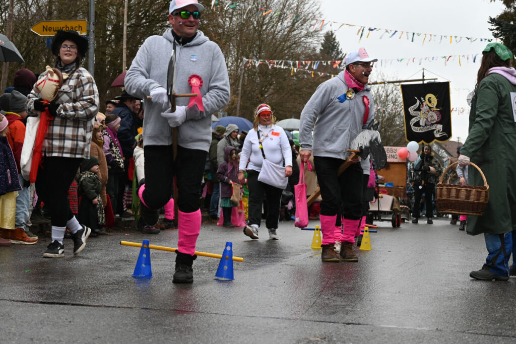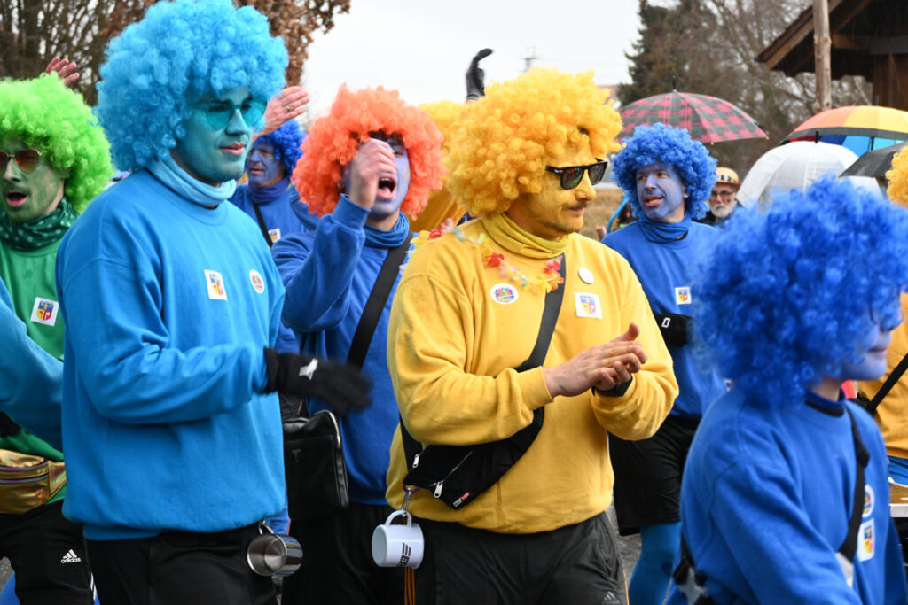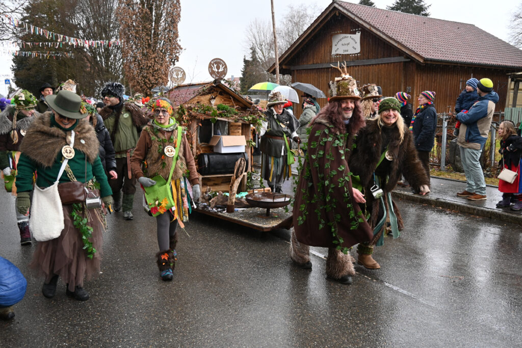 Auch aus den Nachbarorten kamen närrische Abordnungen: Die Phönix-Feuervögel aus Mennisweiler leuchteten in Orange, Rot und Schwarz, während die Ulkgruppe aus Wassers als Waldmenschen samt fahrbarem Holzhaus unterwegs war.