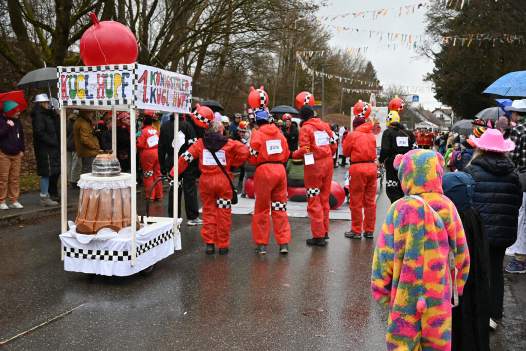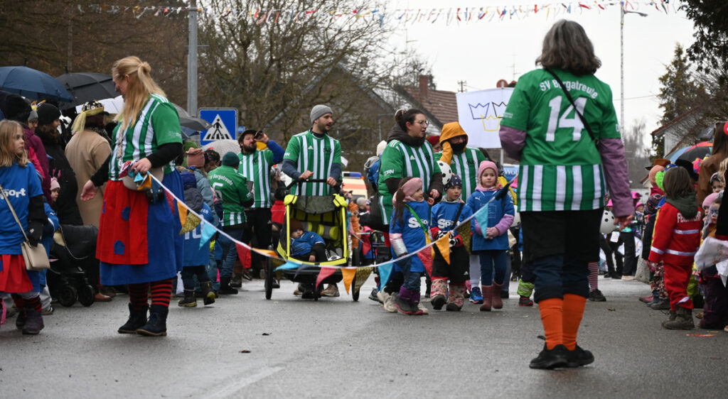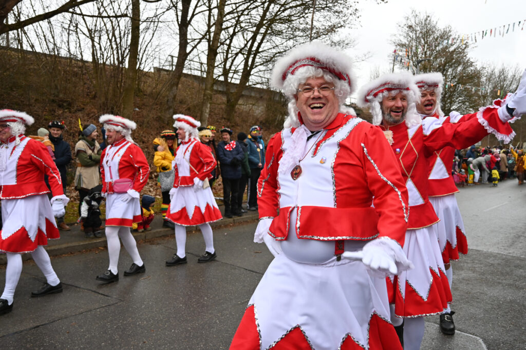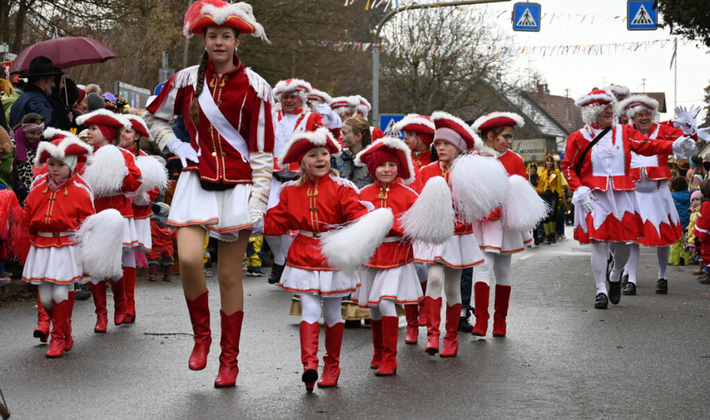 Traditionell eröffnete der Büttel den Umzug, gefolgt von der Kindergarde in ihren roten Baretts mit weißem Pelzrand, roten Jacken, weißen Röckchen und roten Stiefeln – ein besonders niedlicher Auftakt. Gleich dahinter marschierten die Waldseer Elfer als Gastgruppe. In rot-weißen Gardekostümen entpuppten sie sich augenzwinkernd als „Ranzengarde“ und sorgten für viele Lacher.