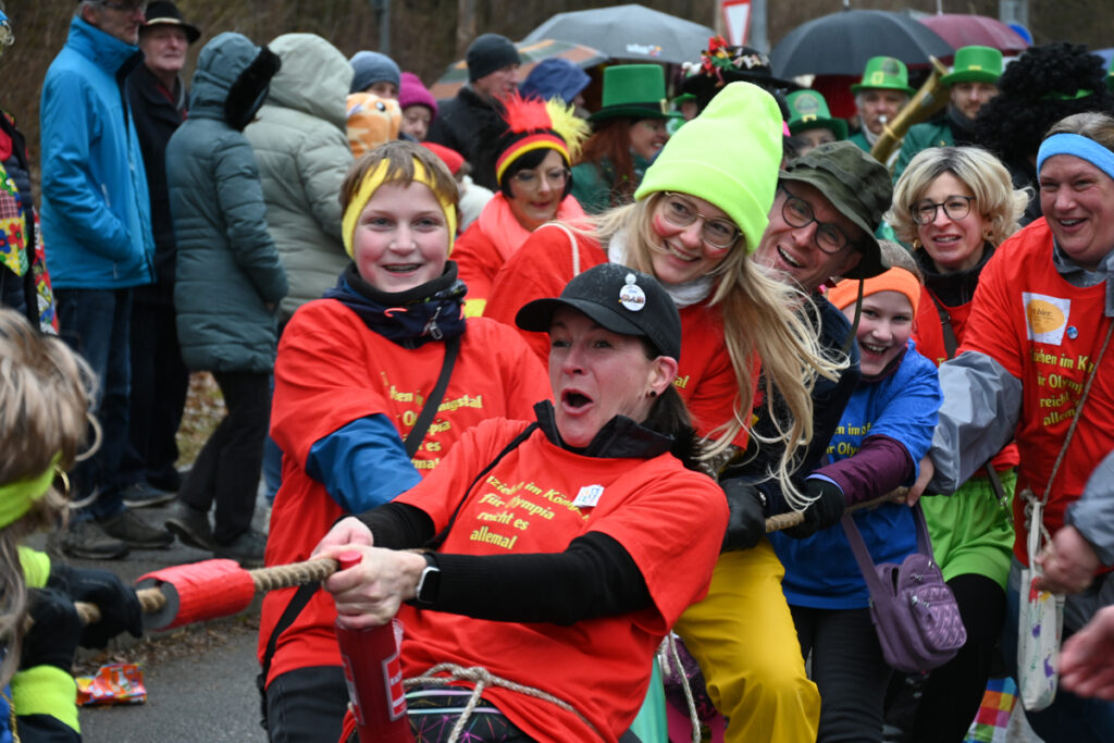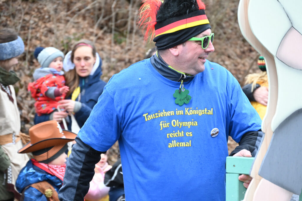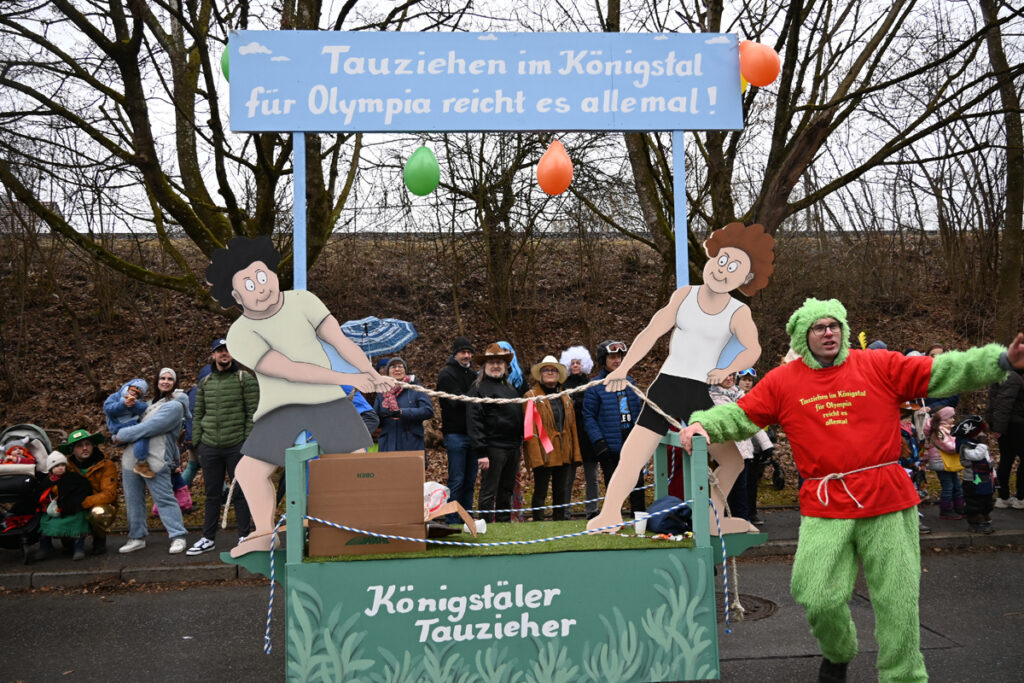 Das diesjährige Motto „Olympia im Königstal“ spiegelte sich in den fantasievollen Gruppen wider. Der Kindergarten trat in weiß-grün gestreiften Fußballtrikots mit dem Schlachtruf „Kindergarten vor – noch ein Tor!“ auf. Regenbogenbunte Fahnenschwinger riefen „Fahne hoch“, während die Tauzieher ein langes Seil durch die Menge zogen und das Publikum kurzerhand in den Wettkampf einbanden.
