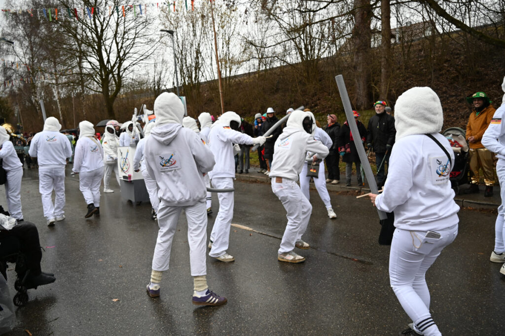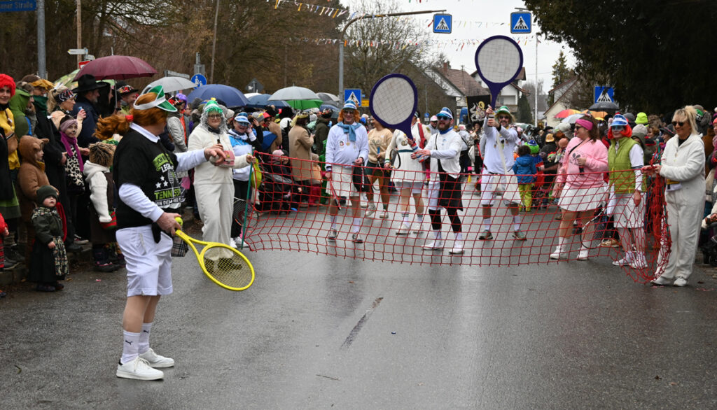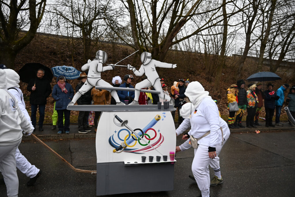 Besondere Hingucker waren die als Olympische Flammen verkleideten Narren mit orange-roten Haaren sowie die „Federbälle“ mit weißem Tüllkleid und rotem Schlagpunkt über dem Kopf – wenn auch mit dem kleinen Nachteil, dass durch das Gitter weder Essen noch Getränke erreichbar waren. Passend dazu lieferten sich die Tennisspieler mit überdimensionalen Schlägern ein närrisches Match um „Spiel, Satz und Sieg“. Mit zierlichem Rösselsprung überwanden die Olympischen Reiter die Hindernisse im Parcours.