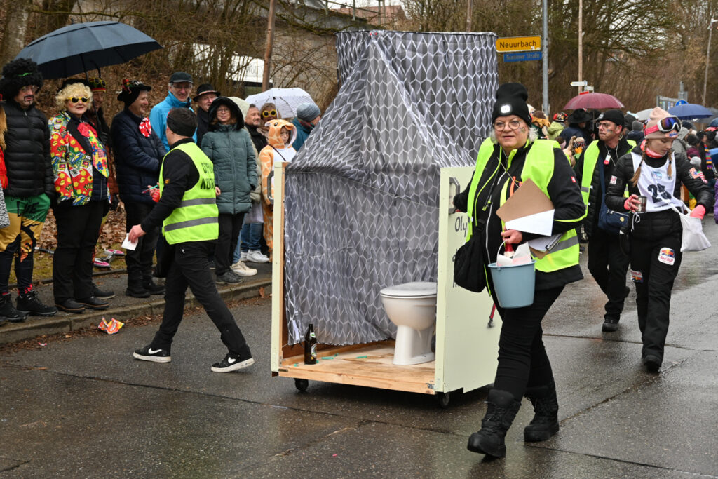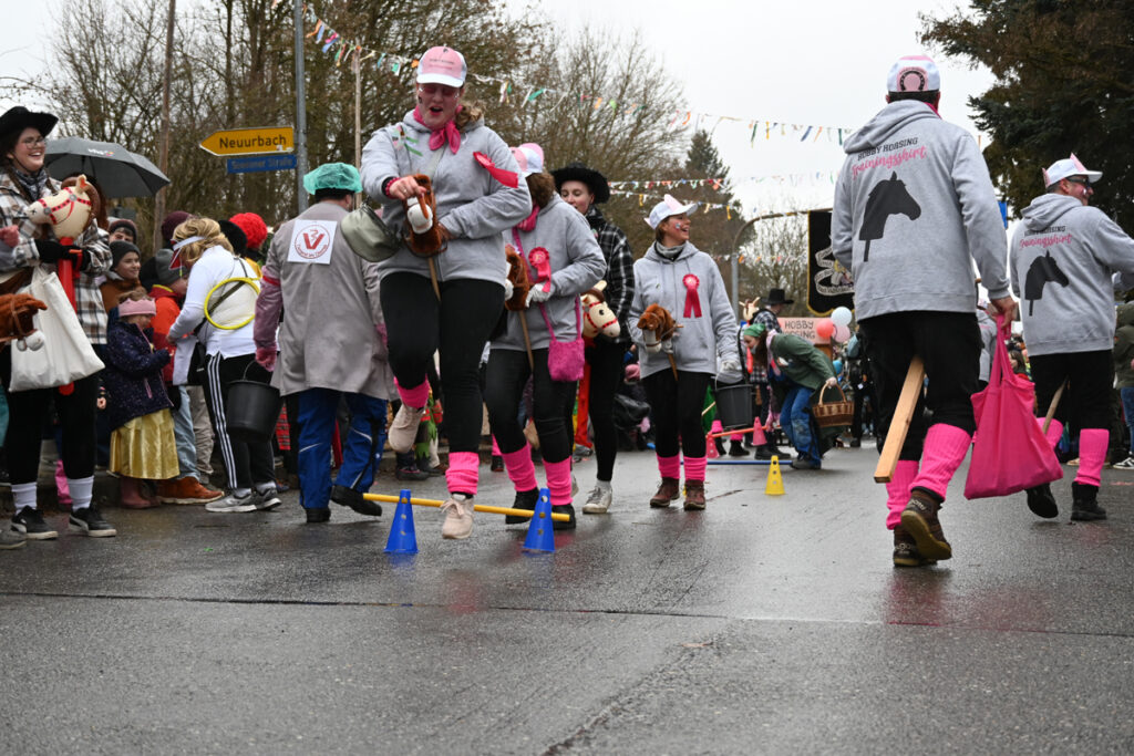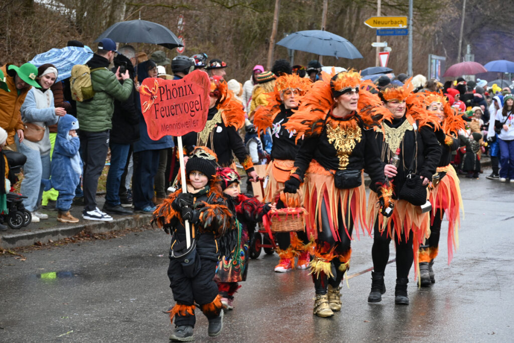 Urbach – Samstag, 14. Februar. Bei kaltem und regnerischem Wetter zog der närrische Lindwurm durchs Königstal – doch weder Narren noch Zuschauer ließen sich die gute Laune verderben. Auch Familie Henne mischte sich unter die wetterfesten Fasnetsfreunde und genoss das bunte Treiben am Straßenrand.