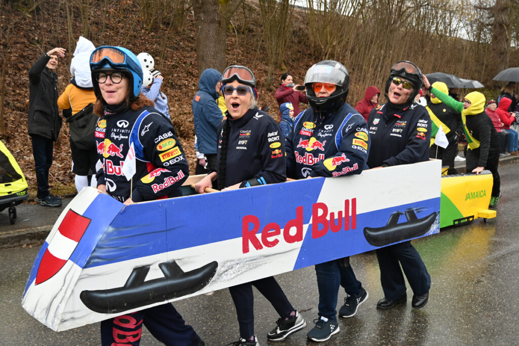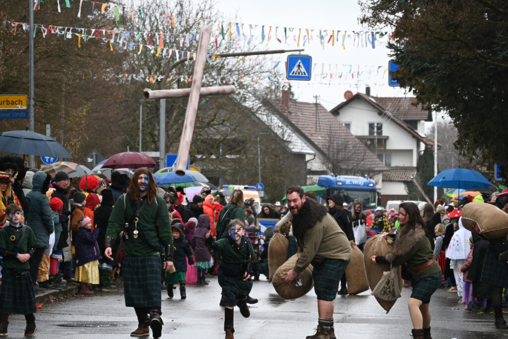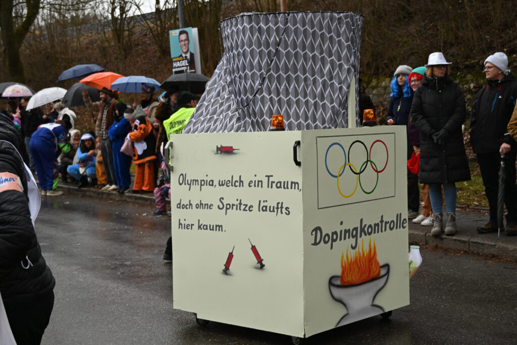 Musikalisch glänzte die Waldseer Gugga-Gassa-Fetz-Band in neuen Kostümen. Fechter, Skispringer, Bobfahrer und sogar eine augenzwinkernde Dopingkontrolle mit mitgeführtem „Thron“ reihten sich ein. Für zusätzliche Gaudi sorgten irische Kraftsportler mit Papp-Holzstämmen und Strohsäcken sowie die Gruppe „Kugel-Hupf“, die Zuschauer auf Hüpfbällen gegeneinander antreten ließ.