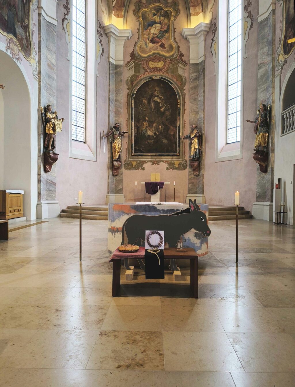 In einer feierlichen Prozession ging es nach der Eröffnung gemeinsam in die Pfarrkirche hoch. Da während der gesamten Feier unsere kleinsten Gemeindemitglieder im Mittelpunkt standen, waren diese immer wieder mit eingebunden. So durften zum Vaterunser alle Kinder in einen großen Kreis im Altarraum kommen.