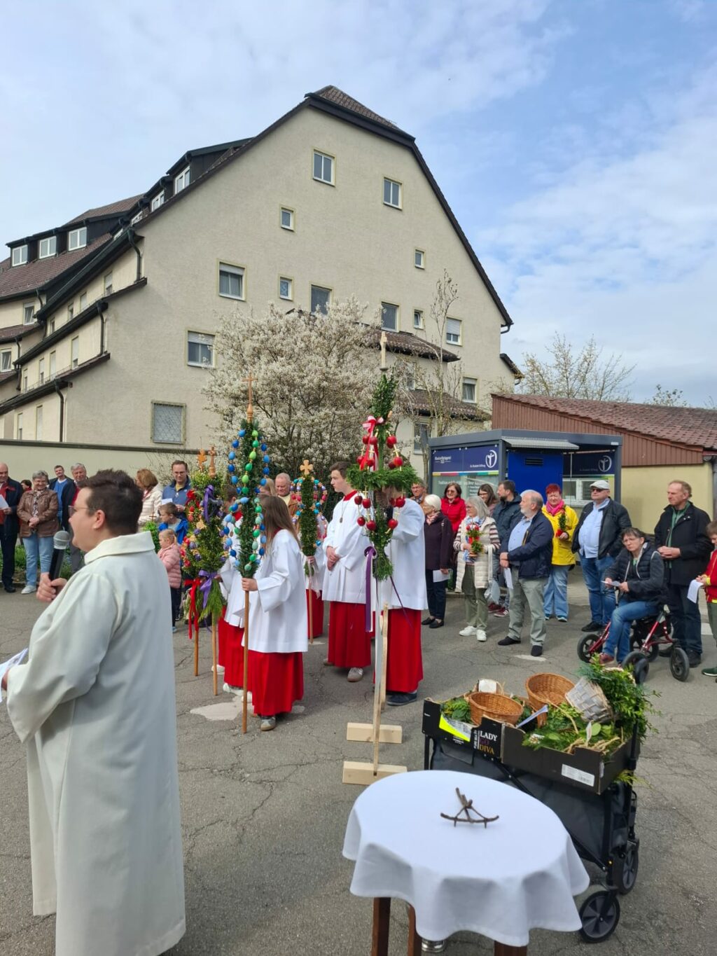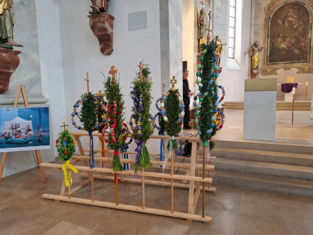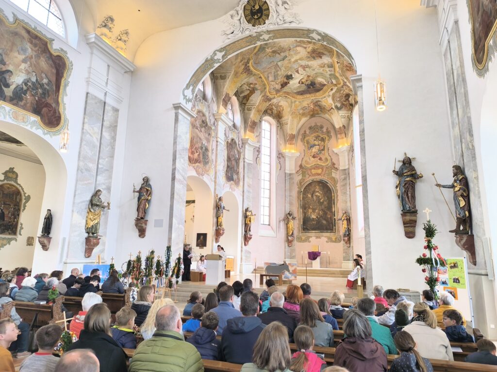 Reute – Viele Familien folgten der Einladung zur Feier des Palmsonntags nach Reute. Zur Eröffnung der Wort-Gottes-Feier trafen sich die Mitfeiernden bei der Klosterschreinerei. Prächtige kleine und große Palmen wurden in Erinnerung an den Einzug Jesu nach Jerusalem von stolzen Kindern präsentiert.
