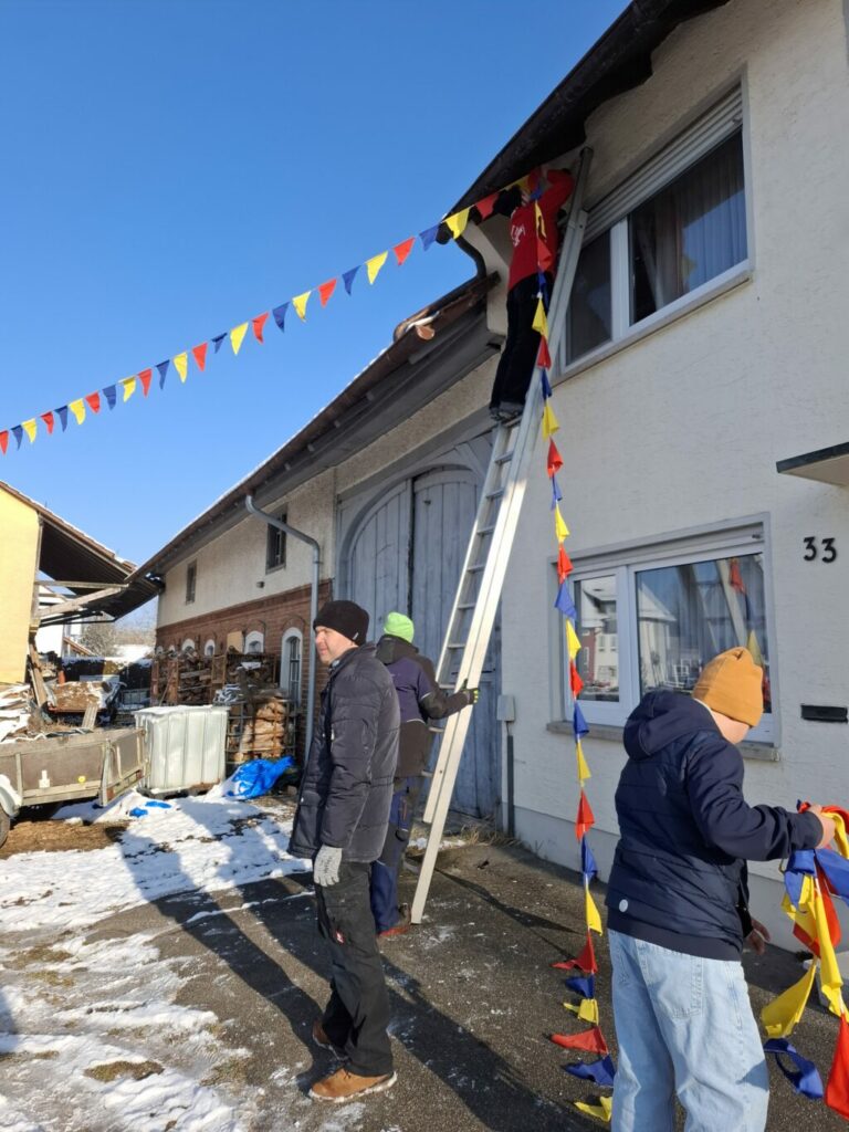 Reute – Am vergangenen Wochenende wurden die farbenfrohen Wimpel, die an das Ortswappen angelehnt sind, quer durch die Reutener Straßen entlang der Umzugsstrecke aufgehängt.