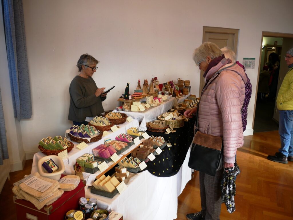 Zu den Höhepunkten gehörte wiederum das kulturelle Angebot in der Pfarrkirche St. Johannes Baptist. Hunderte Menschen strömten am Nachmittag in die Kirche, um sich zuerst an einer meditativen „Klangzeit“ des Musikerduos Verena Westhäußer und Johannes Tress zu erfreuen. Traditionell glänzte „Tausendsassa“ Barny Bitterwolf, dieses Mal mit Sangespartner Roland Fitz, mit Auszügen aus seinem Werk „Frai de hait, sisch Weihnachtszeit“ und mit instrumental begleiteten, von ihm verfassten schwäbischen Liedern und Gedichten. Proppenvoll war die Kirche auch, als der Frauenchor „InTakt“ aus Bergatreute erstmals hier als Vokalensemble einen ganz starken Auftritt mit vielstimmigem Gesang und den „Vokalitäten“, geleitet durch Trudi Altmann, hatte.