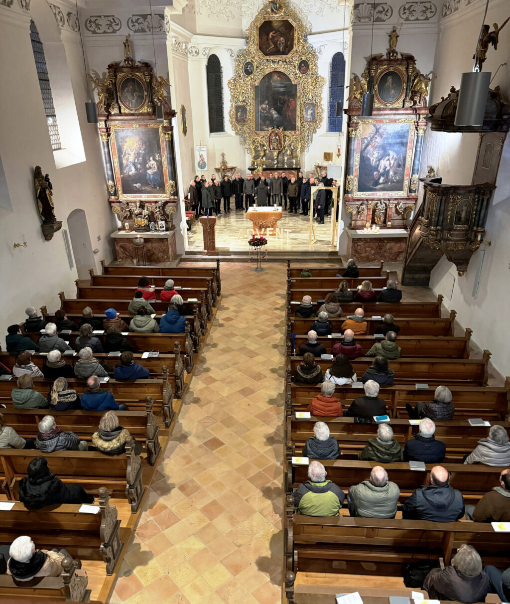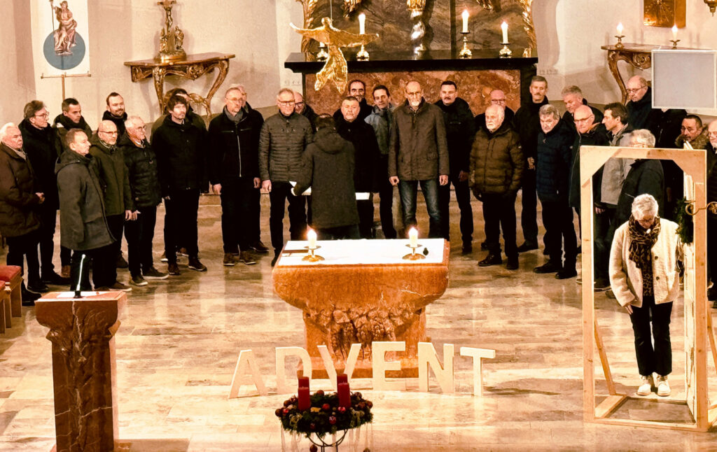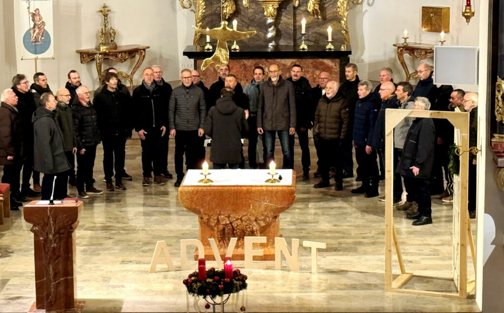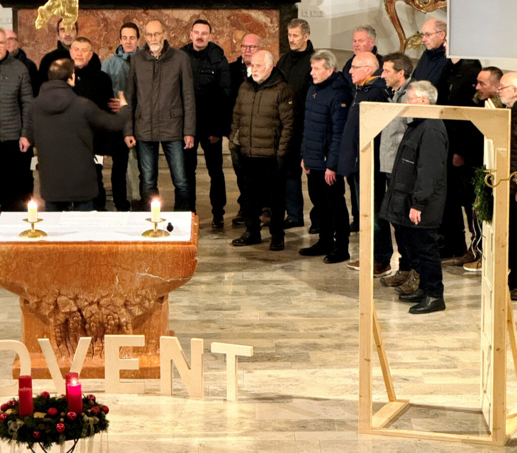 Am selben Spätabend übernahm die Sängerschar unter Leitung von Claudius Maier auch die gesangliche Begleitung des ersten „Türöffner-Gottesdienstes“ der Seelsorgeeinheit Bad Waldsee in der Haisterkircher Pfarrkirche St. Johannes Baptist. Ohne instrumentale Begleitung wusste die Sängerschar mit dem gefälligen, adventlichen, wunderschön vorgetragenen Liedgut, die Herzen der zahlreich gekommenen Gottesdienstbesucher zu öffnen für besinnliche Momente in der Adventszeit. Dass dies so gelang, verdankte man auch den beiden Lektorinnen Gabriele Spieler und Waltraud Ruf, die bedenkenswerte Impulse mit ihren Gebeten, Fürbitten und Lesungen schenkten. Pfarrer Stefan Werner löste sich aus der Reihe der Sangeskameraden, nahm ein Kleinkind auf seine Arme und ließ das Kind dann die erste Kerze am Adventskranz anzünden. Hohe Symbolkraft hatten ein über dem Altartisch schwebender goldener Engel, der während dieser Vorbereitungszeit auf das Weihnachtsfest an die Geburt Jesu erinnern hilft und auch die geöffnete Türe daneben. Der anhaltende Beifall galt all den Gestalterinnen und Gestaltern des berührenden „Türöffner-Gottesdienstes an diesem Vorabend des 1. Adventssonntag.