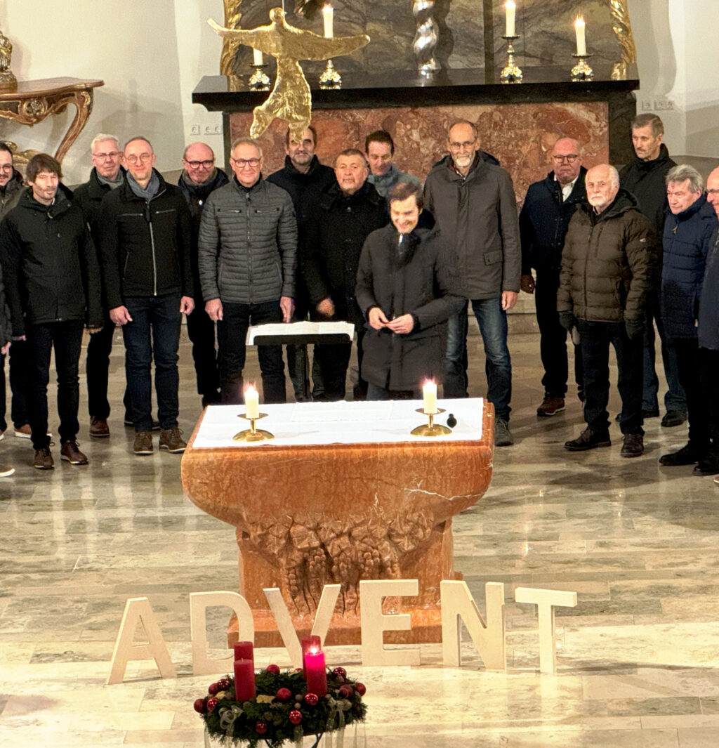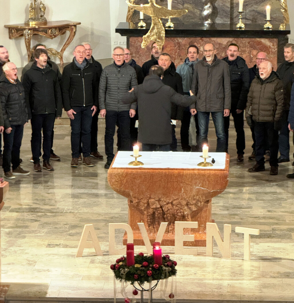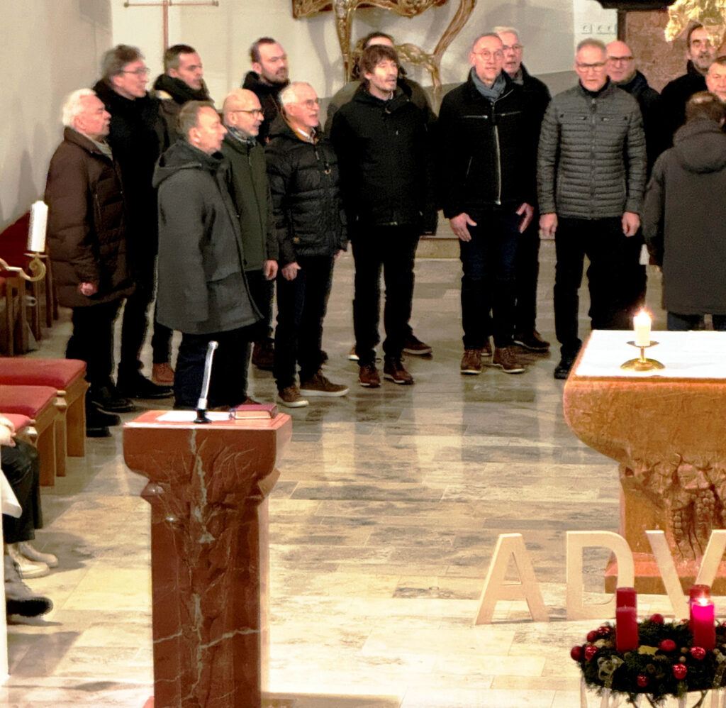 Am selben Spätabend übernahm die Sängerschar unter Leitung von Claudius Maier auch die gesangliche Begleitung des ersten „Türöffner-Gottesdienstes“ der Seelsorgeeinheit Bad Waldsee in der Haisterkircher Pfarrkirche St. Johannes Baptist. Ohne instrumentale Begleitung wusste die Sängerschar mit dem gefälligen, adventlichen, wunderschön vorgetragenen Liedgut, die Herzen der zahlreich gekommenen Gottesdienstbesucher zu öffnen für besinnliche Momente in der Adventszeit. Dass dies so gelang, verdankte man auch den beiden Lektorinnen Gabriele Spieler und Waltraud Ruf, die bedenkenswerte Impulse mit ihren Gebeten, Fürbitten und Lesungen schenkten. Pfarrer Stefan Werner löste sich aus der Reihe der Sangeskameraden, nahm ein Kleinkind auf seine Arme und ließ das Kind dann die erste Kerze am Adventskranz anzünden. Hohe Symbolkraft hatten ein über dem Altartisch schwebender goldener Engel, der während dieser Vorbereitungszeit auf das Weihnachtsfest an die Geburt Jesu erinnern hilft und auch die geöffnete Türe daneben. Der anhaltende Beifall galt all den Gestalterinnen und Gestaltern des berührenden „Türöffner-Gottesdienstes an diesem Vorabend des 1. Adventssonntag.