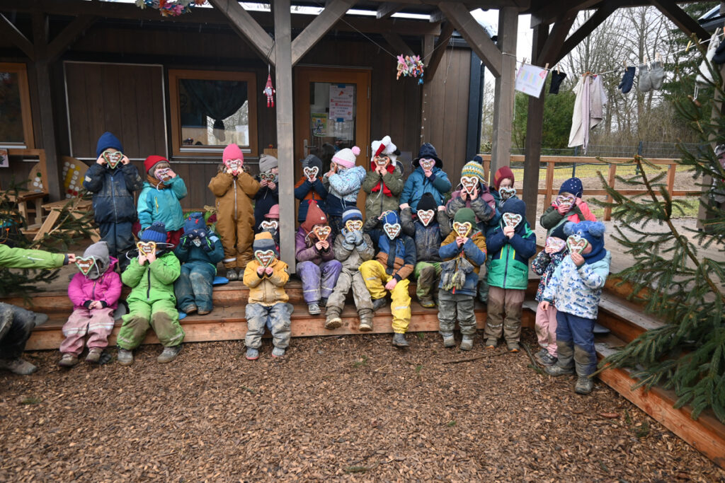 Mit der traditionellen „Locke“ zog die Sammlerabordnung in den Kindergarten ein. Sofort wurden alle Spielsachen, Schubkarren, Grabschaufeln und womit sich die Kinder eben grade beschäftigten, zur Seite gelegt und die Gruppe versammelte sich um ihre Erzieherinnen und Erzieher auf der Terrasse der Schutzhütte. Viele sind auch als Mäschkerle verkleidet.