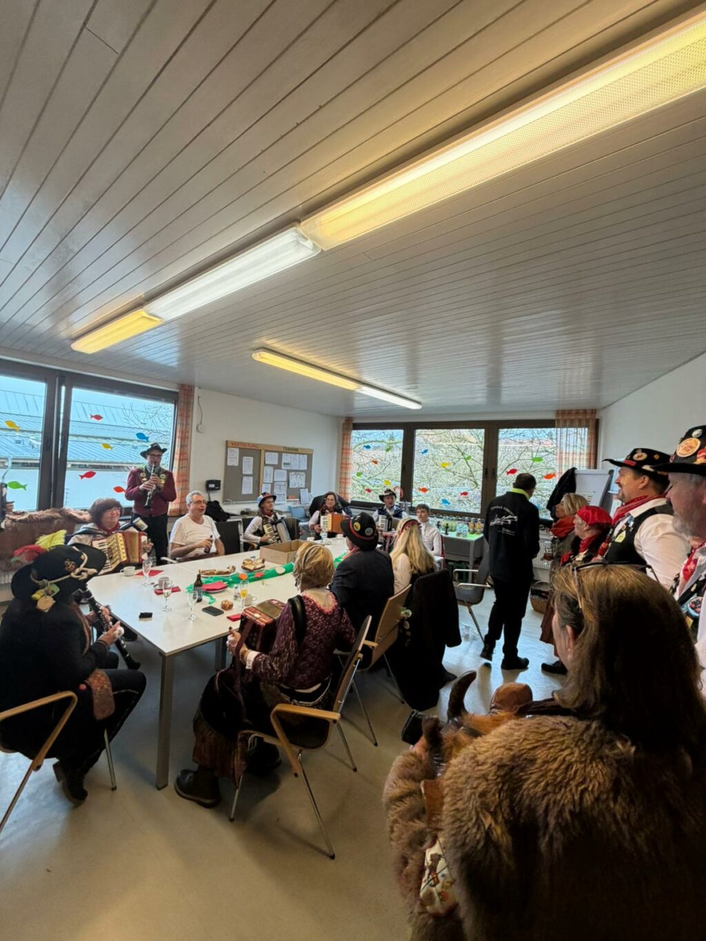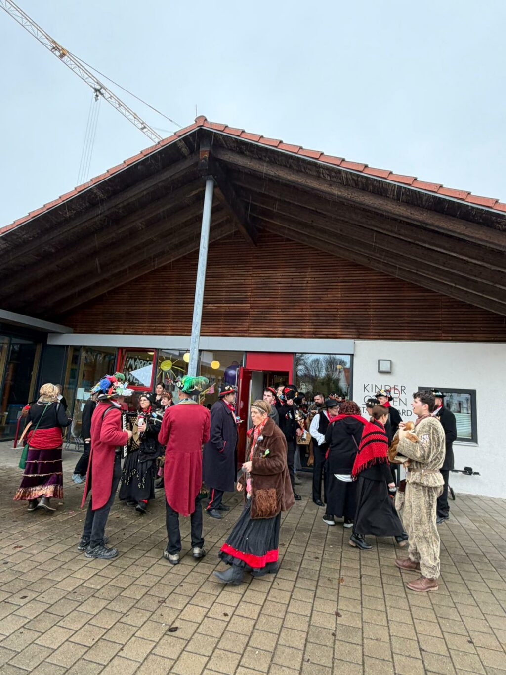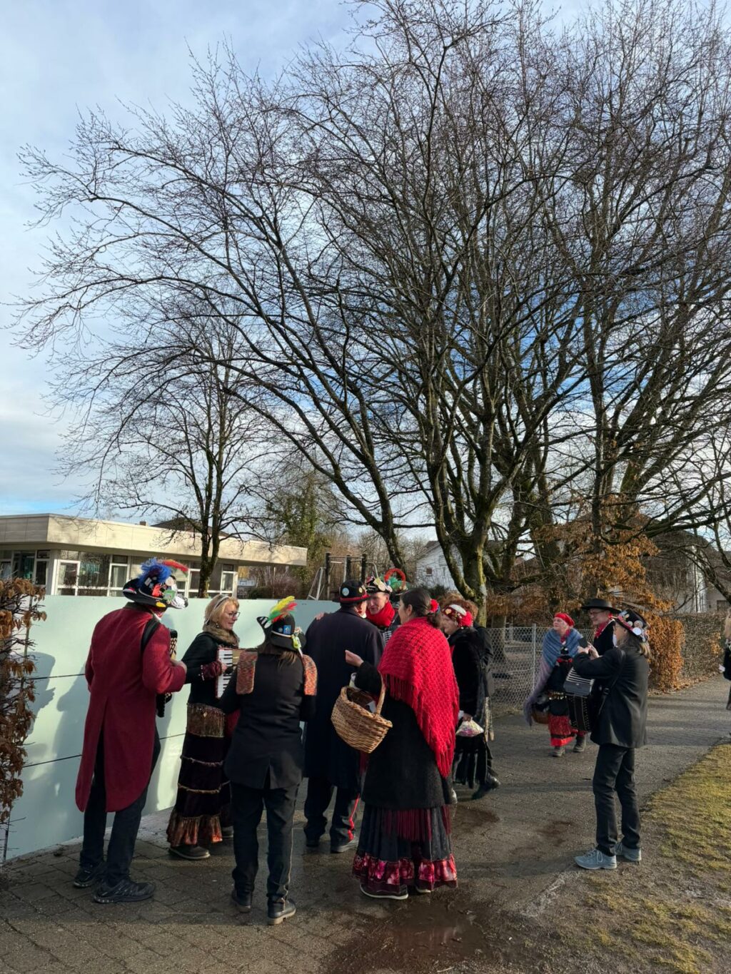 Zuvor hatten die Mitglieder der Narrengilde Reute bereits der Raiffeisenbank einen Besuch abgestattet, bevor es weiter zur Schule und anschließend in die beiden Kindergärten ging. Die Narrengilde hatte es sich zur Aufgabe gemacht, die Kinder vom Unterricht zu befreien. Mit lautem Getöse und fröhlicher Schnurrermusik zog die Zigeunergruppe mit den Scherenschleifern durch die Klassenzimmer. Unterstützt wurden sie dabei von einigen Maskenträgern der Narrengilde.