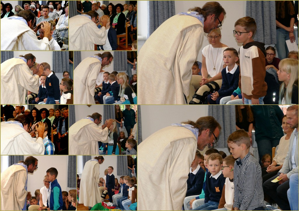 Mit Gebeten, Bibeltexten, Fürbitten, vorgetragen von Eltern und Lehrkräften,, religiösem Liedgut, professionell begleitet am Klavier durch die Schulleiterin Angelika Zimmermann, wurde der Wortgottesdienst zu einer Bereicherung für alle Anwesenden. Pfarrer Werner machte deutlich, dass alle zu Gottes Familie Kunterbunt gehören. Jedem Schulneuling legte er dann die Hände auf und erbat Gottes Segen für alle. Dazu erhielt jedes der Kinder ein hilfreiches Segensband von ihm.