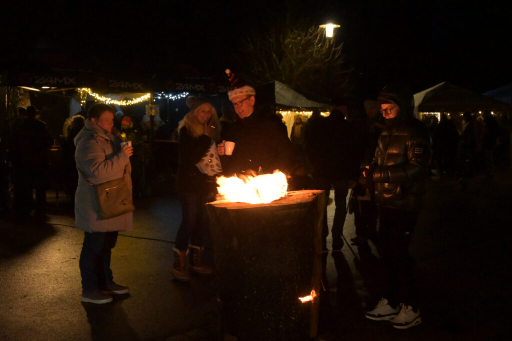 Trotz der kalten Temperaturen herrschte auf dem Weihnachtsmarkt eine warme Atmosphäre. Angefeuert von den lodernden Flammen aus den angeschnittenen Baumstämmen, die für eine ganz besondere Stimmung sorgten.