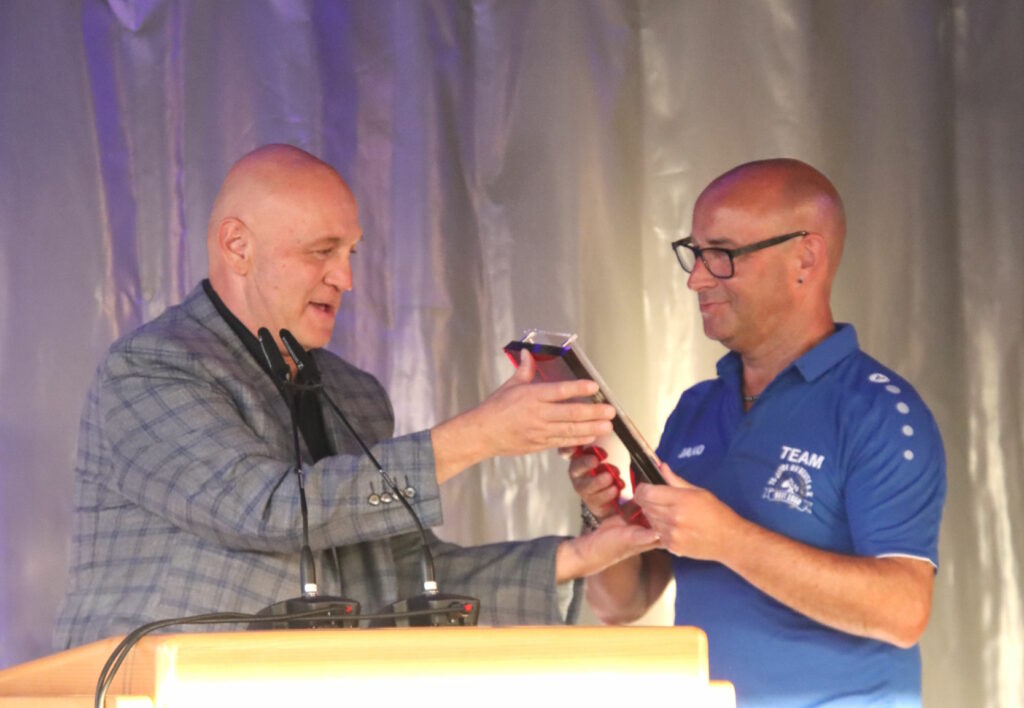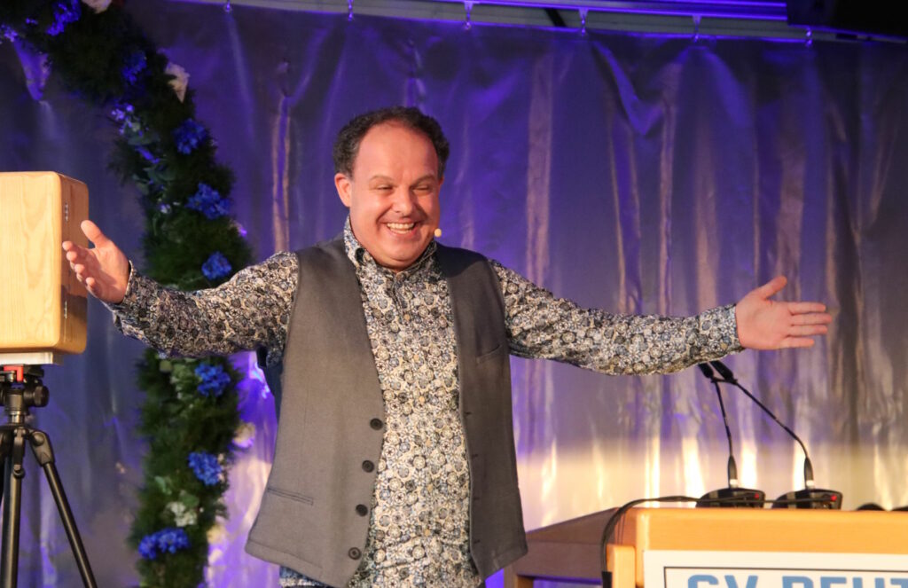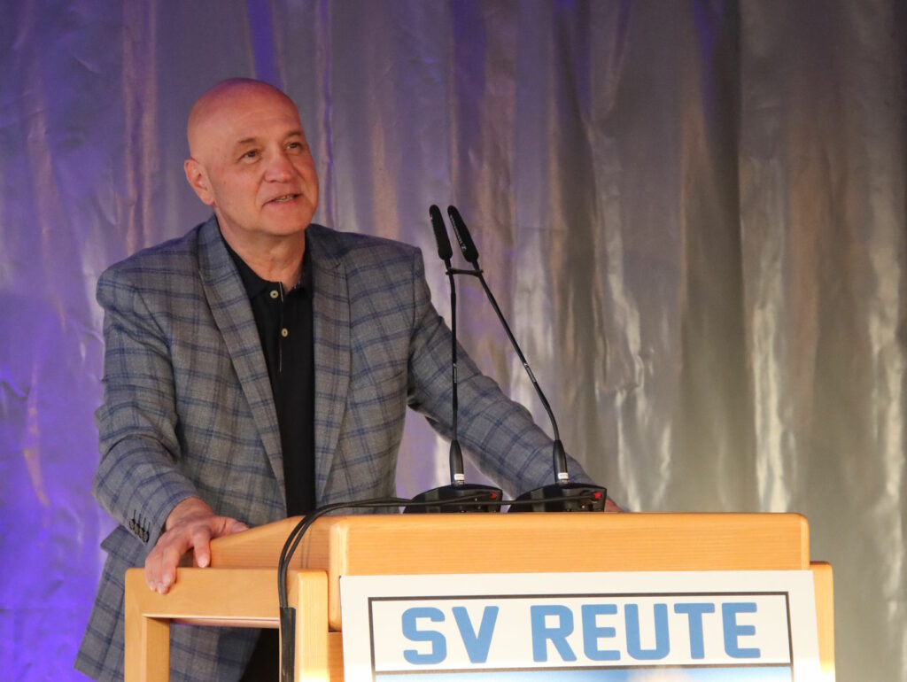 Feierlich eröffnete der Fanfarenzug Reute den Festabend auf dem Reutener Sportgelände. Neben Ehemaligen waren erfreulich viele Freunde und Ortsansässige der Einladung des SV Reute gefolgt und sorgten für einen würdigen Rahmen beim schön dekorierten Verkaufsunterstand “Lounge1950”. Manuel Pfender moderierte in bewährter Weise den Festabend und gab einen kurzen Überblick über den Ablauf. Oberbürgermeister Matthias Henne, WFV-Bezirksvorsitzender Nuri Saltik, Werner Gros als Vorstandsmitglied des Sportkreises Ravensburg und Lothar Hanser von der Raiffeisenbank Reute-Gaisbeuren gratulierten in ihren Grußworten dem Jubilar und waren jeweils nicht mit leeren Händen gekommen – für die großzügigen Spenden zum Jubiläum gab’s lauten Applaus. Stimmenimitator Peter von Kron überbrachte als “Thomas Gottschalk” ebenfalls Grußworte von allerlei Prominenten und sorgte für Lacher im Publikum.