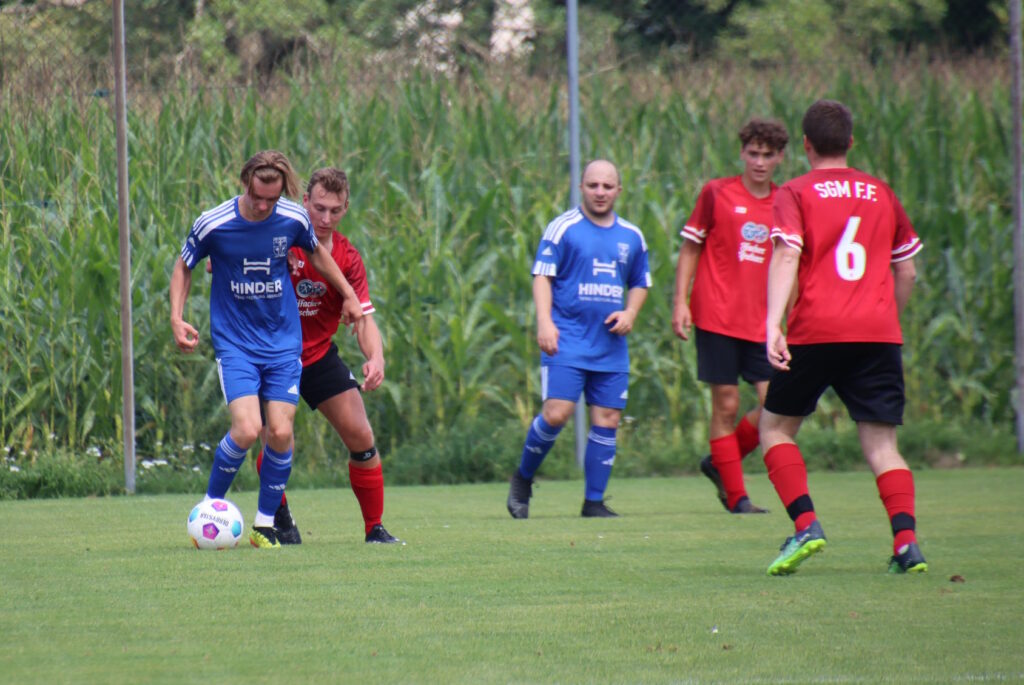 Das erwartet schwierige Spiel bei sommerlichen Temperaturen gegen die körperlich robuste SGM Fronhofen/Fleischwangen war es von Beginn an. Die Kugel lief auf beiden Seiten teilweise schon recht gut durch die Reihen und die erste Tormöglichkeit besaßen die Gastgeber. Justin Matt scheiterte aber mit seinem Abschluss aufs kurze Eck am stark reagierenden Keeper. Fünf Minuten später wurde es im Reutener Strafraum nach einem Rückpass erstmals brenzlig, doch SVR-Keeper David Munz griff im Nachfassen entschlossen zu. Nach gut einer halben Stunde liefen die Reutener in einen Konter, doch es konnte zum Eckball geklärt werden. Nur wenig später spritzte Kevin Kraus in einen Rückpass und hätte den Keeper beinahe überrascht. Unmittelbar vor dem Halbzeitpfiff hatte Justin Matt die Riesenchance auf die Führung, doch sein Abschluss ging denkbar knapp am langen Pfosten vorbei.