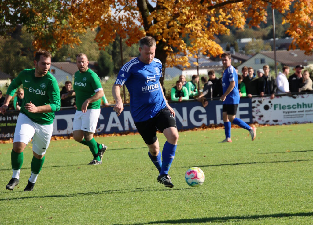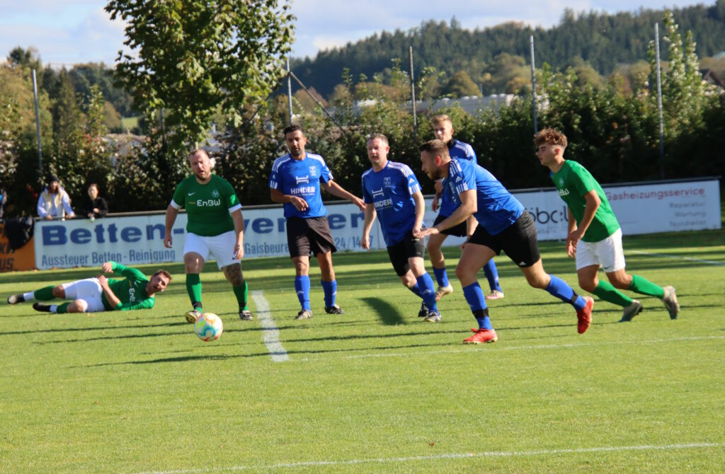 Der Spitzenreiter war am Reutener Durlesbach auf ein schnelles Tor aus, doch die Reutener Zweite stand defensiv sehr solide und ließ zunächst nichts anbrennen, Keeper Dennis Kern war ein paar Mal glänzend auf dem Posten. Aufgrund etlicher Ausfälle bekam Team Zwei mit Sven Patent und Serkan Akbalik Verstärkung aus der Reutener AH-Mannschaft. Nach einer guten halben Stunde gelang den Gästen dann aber doch der Führungstreffer, als sich Bergatreute auf der rechten Seite durchsetzen konnte und zum Führungstreffer kam. Mit diesem Spielstand wurden die Seiten gewechselt.