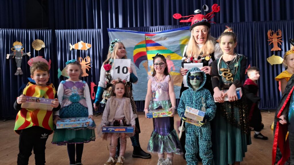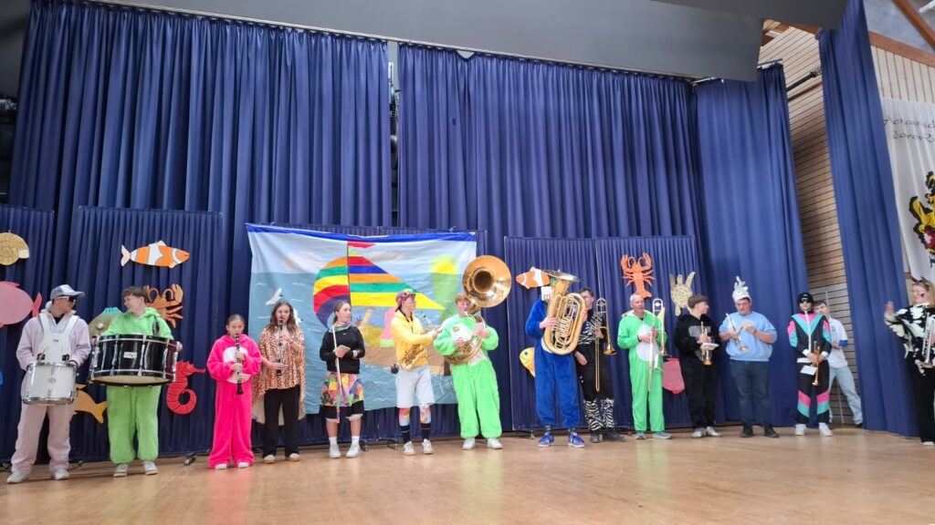 Reute – Direkt nach dem Kinderumzug begann um 14.00 Uhr der Kinderball am Samstagnachmittag in der Durlesbachhalle. Die Halle war – passend zum Motto „Fischers Fritze fischt in Reute nicht nur Fische, liebe Leute“ – mit viel Liebe zum Detail dekoriert und kaum wiederzuerkennen: Überall funkelten Meeresfarben, bunte Fische schwebten über den Köpfen der Gäste und Korallenmotive schmückten die Wände. So entstand eine richtige Unterwasserwelt, in der sich die kleinen Narren sofort zuhause fühlten. Der Fanfarenzug eröffnete den Kinderball mit seinem Einmarsch.