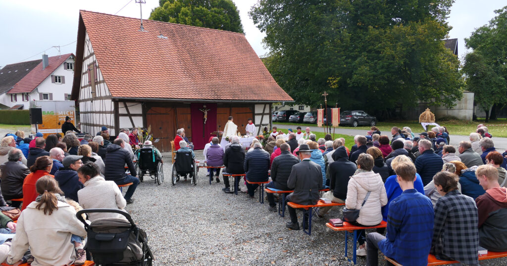 Erntedankgottesdienst in Mennisweiler (bei Bad Waldsee); rechts sieht man die aus Getreideähren geflochtene Erntekrone. Im Rahmen der Eucharistiefeier an Kochs Schopf wurde die neue Kapellenglocke geweiht.