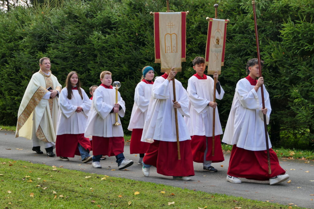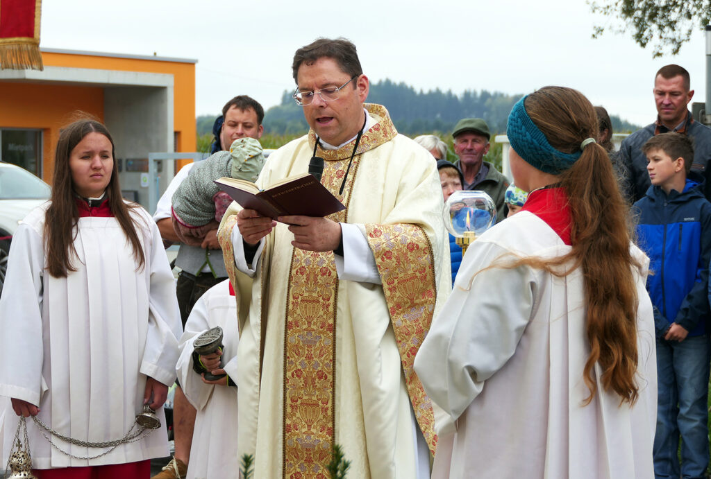 So viel Weihrauch hat Mennisweiler tatsächlich vermutlich noch gar nie, jedenfalls schon längere Zeit nicht mehr, erlebt. Die Glockenweihe fand nämlich im Nachgang eines gar feierlichen Erntedank-Gottesdienstes mit rund 150 Besucherinnen und Besuchern, darunter auch Oberbürgermeister Matthias Henne, mit einem wunderbaren „Erntedankaltar“ auf dem Gelände des Hofguts Koch-Längle in der Mennisweiler Bürgerstraße statt. In seiner Predigt, die Pfarrer Stegmaier immer wieder auch mit ganz persönlichen Erlebnissen um das Thema Kirchen- und Kapellenglocken bereicherte, ging er auf die Bedeutung von Kirchenglocken ein, die er als „hohes Kulturgut“ bezeichnete. „Da fehlte etwas im Dorf“, so gab er die Bemühungen wieder, die seit dem Verstummen der ehemaligen Glocke aus dem Jahr 1950 zu den Gesprächen mit der Stadtverwaltung führten, vertreten im Wesentlichen durch Bürgermeisterin Monika Ludy und Stadtbaumeister Andreas Heine-Strahl, Ortsvorsteher Franz Spehn und seinem Nachfolger Nico Hauff, den Ortschaftsräten aus Mennisweiler, Maria Koch und Johannes Albanbauer, deren Vorgänger Rainer Schuhmacher und Birgit Kolodziej und der Kirchengemeinde, vertreten durch Thomas Neyer, dem Gewählten Vorsitzenden. Spenden aus der Kirchengemeinde Molpertshaus (wozu Mennisweiler gehört), der Dorfgemeinschaft Mennisweiler, vom zahlreichen Einzelpersonen, auch Spenden der Unternehmer, die die Kiesgruben bei Mennisweiler betreiben, und ein Beitrag der Stadt Bad Waldsee ermöglichten die Instandhaltung des Läutwerks und die Anschaffung der 50 kg schwere Glocke, die von der Gießerei Perner in Passau gegossen wurde.