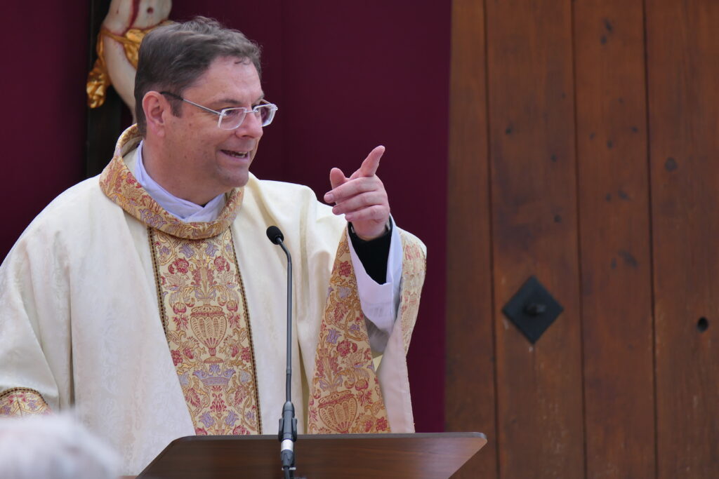 Pfarrer Klaus Stegmaier beim Freilicht-Gottesdienst in Mennisweiler (das kirchlich nach Molpertshaus / Gemeinde Wolfegg) und politisch zu Mittelurbach (Stadt Bad Waldsee) gehört.