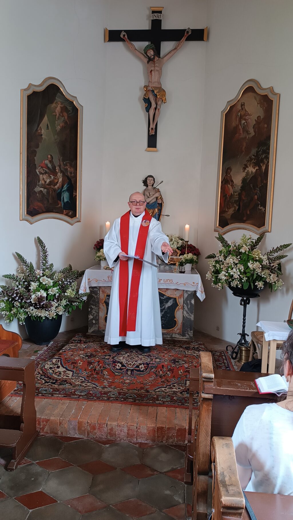 Mit einem Gottesdienst von Pater Hubert Vogel wurde das Fest in der herrlich geschmückten Kapelle festlich eröffnet. Viele Personen aus Enzisreute füllten schon früh das Gotteshaus. Zusammen mit dem Team der Heimatpflege und weiteren Sponsoren mussten sogar Stehplätze eingenommen werden. „Das Kreuz ist ein Segenszeichen für Christen, in Freud und Leid soll es uns im Alltag begleiten“, so der Zelebrant. „Es ist wichtig, dass wir das Kreuzeszeichen auch unseren Kindern und Enkeln weitergeben“. Und zum Schluss: „Manche Fußballspieler bekreuzigen sich vor dem Spiel oder nach einem erzielten Tor, lernen wir von ihnen“.