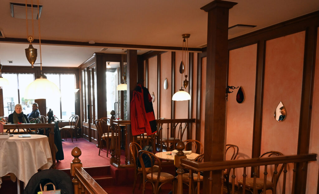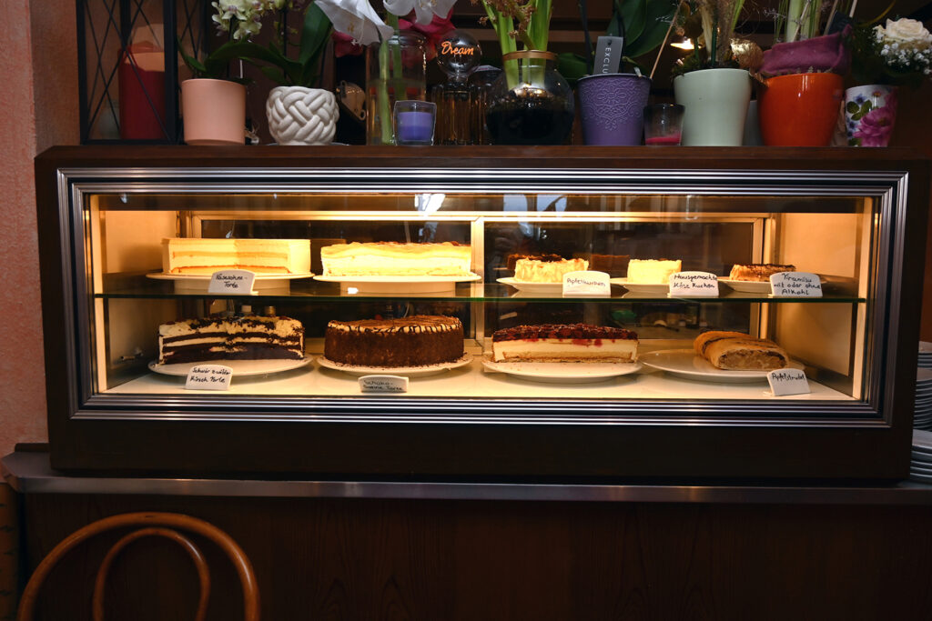 Die Karte ist reichhaltig. Hier gibt’s Kaffees, Lattes, Espressi, Capuccini, Tees und Schokoladen in mannigfaltiger Ausführung. Die Theke ist reichlich ausgestattet mit Kuchen, Torten und Strudeln.