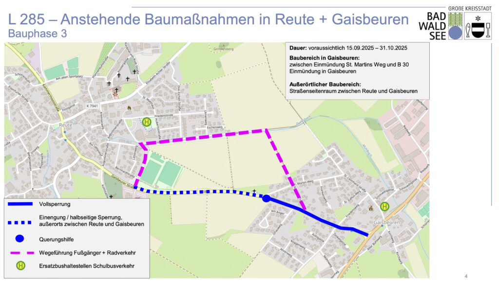 Aktuelle Informationen werden regelmäßig im Amtsblatt sowie auf der Homepage der Stadt veröffentlicht unter https://www.bad-waldsee.de/buerger/de/leben-wohnen/bauen-wohnen/baumassnahmen-an-der-landesstrasse-285-in-reute-und-gaisbeuren