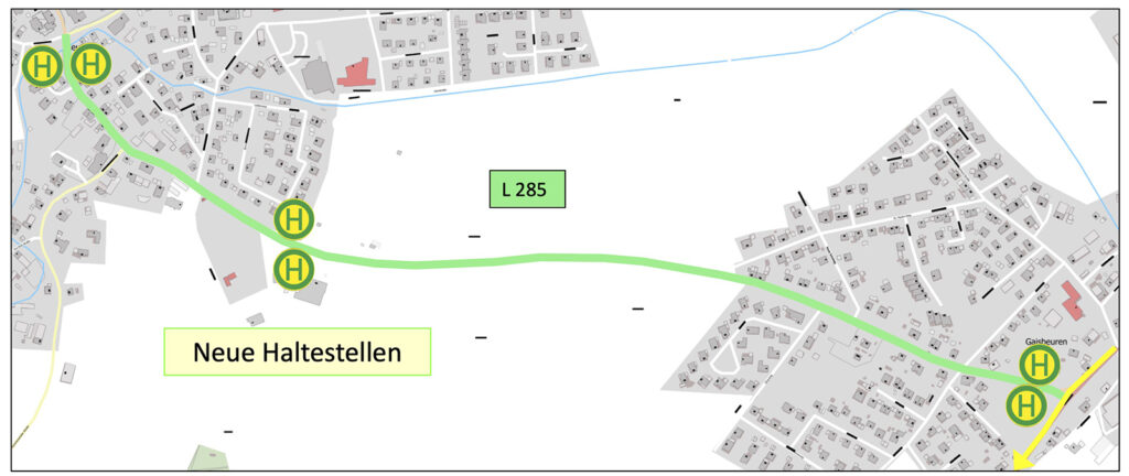 Nun können für beide Fahrtrichtungen Haltepunkte am östlichen Ortsrand (Ortsausfahrt in Richtung Gaisbeuren) eingerichtet werden. Die Lage der neuen Haltepunkte ist im beigefügten Plan dargestellt. Die Busse sollen künftig an diesen Stellen auf der Fahrbahn halten. Ziel ist es, ein attraktives zusätzliches Ein- und Ausstiegsangebot in der Nähe von Nahversorger, Bank, Sportplatz und Friedhof zu schaffen. Besonders für ältere Bürgerinnen und Bürger aus Gaisbeuren kann dies eine Verbesserung darstellen. Für Fahrgäste aus den angrenzenden Wohngebieten verkürzt sich der Weg zur Haltestelle. In unmittelbarer Nähe befindet sich zudem eine Parkmöglichkeit, sodass also auch ein Park + Ride Angebot geschaffen werden kann.