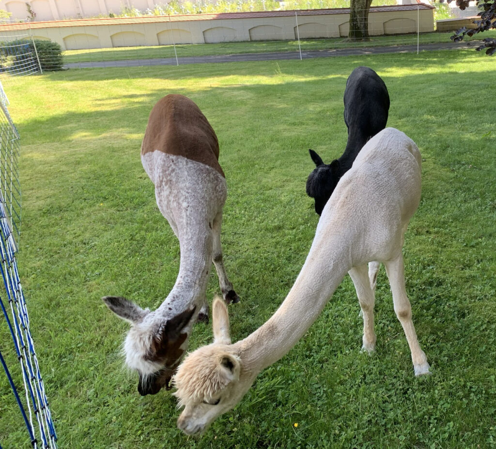 Weiter unten im Schatten einer alten Blutbuche war die saftig-grüne Wiese eingezäunt, der Grund: Andreas Schuler, ehemaliger Klostergärtner, und seine Schwester Christiane (Tiertherapeutin) kamen mit vier Alpakas in das gemütliche Gehege. Die beiden wussten viel von den anhänglichen Tieren zu berichten. Besonders ihre Neugier im Zusammensein mit ihren Haltern sei verblüffend. Später gesellten sich noch zwei Esel hinzu, über die die Tiertherapeutin Vieles erklärte. Zu dieser Attraktion mussten die Tiere viele Fototermine wahrnehmen. Und von den Alpakas spuckte tatsächlich eines der Tiere auch mal in Richtung staunend lachender Besucher.