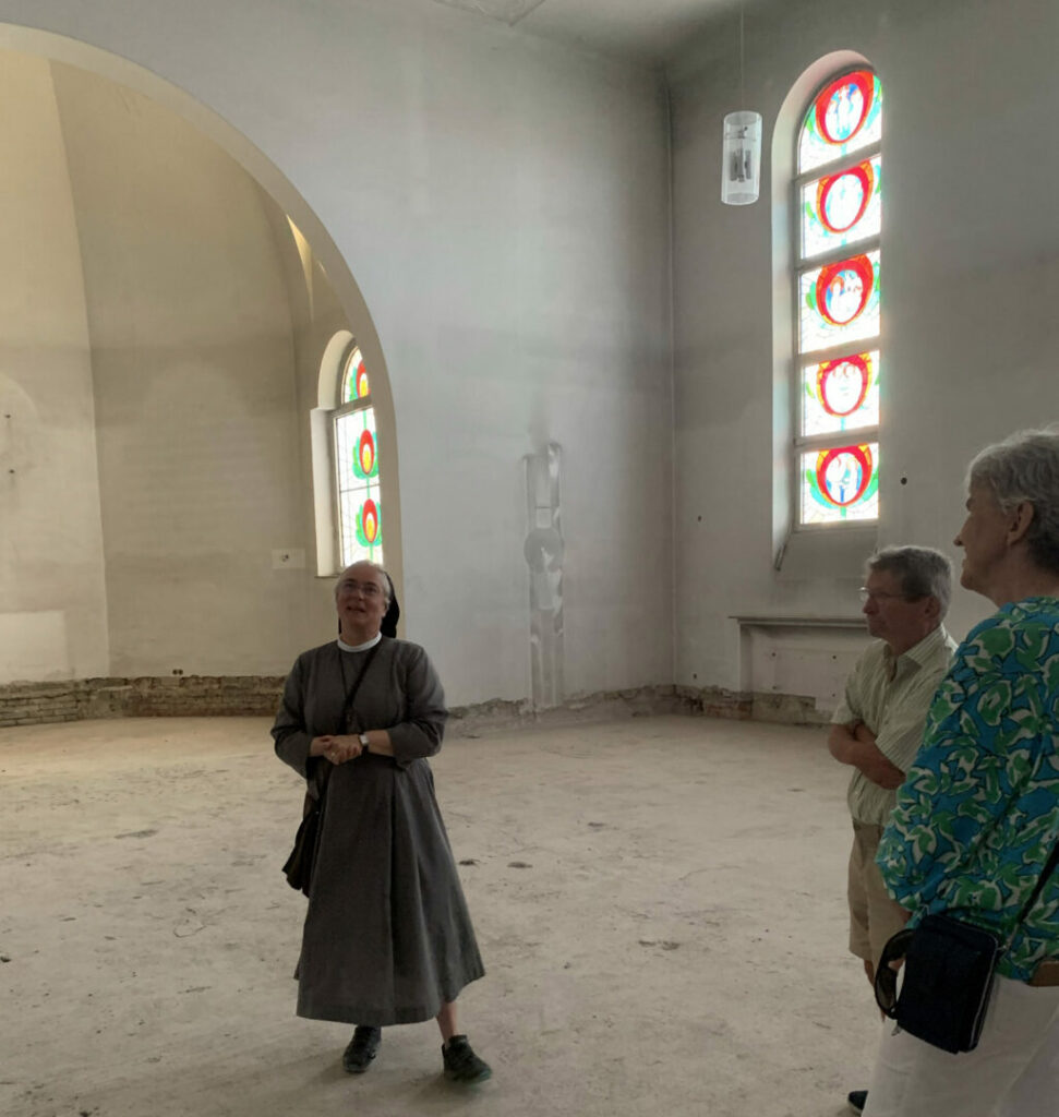 Allein neun Baustellenführungen wurden abwechselnd von Generaloberin Sr. Maria-Hanna und Claus Mellinger, Leiter der Stabsstelle Projektmanagement, angeboten. Die Besucher konnten so sämtliche Komponenten des ambitionierten und mutigen Klosterbergprojekts kennenlernen. Bekanntlich entstehen im Mutterhaus zwölf kleine Wohnungen für Menschen, die klosternahes Wohnen suchen. Von ehemals 50 Interessierten stünden noch siebzehn zur engeren Wahl, so Sr. Maria Hanna und würden weiter geprüft. Es sei beispielsweise mit Begegnungsräumen an künftige Gemeinschaften gedacht, nicht aber an betreutes Wohnen. Das Klosterbergprojekt umfasst auch die künftige Nutzung der Franziskus- und Konventskapellen. So entstünde in der Franziskuskapelle auf der erweiterten Empore ein Oratorium, das beispielsweise zu Exerzitien genutzt werden könne. In der Konventskapelle entstehe eine kleine Kapelle, ähnlich Portiuncula in Assisi, allerdings mit der sie dann umgebenden Klosterbibliothek. Die energetisch problematischen, von Sr. Ludgera gestalteten Kirchenfenster müssten leider dem Nachhaltigkeitsanspruch der Reutener Franziskanerinnen weichen. Auch der künftige verlegte Zugang zur Guth-Betha-Quelle wurde dargestellt.