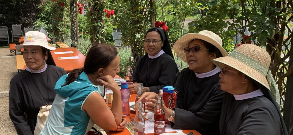 In der Rosenlaube gab es gleich zu Beginn die Möglichkeit, fünf indonesischen Franziskanerinnen zu begegnen. Missionsprokurin Sr. Evelyn informierte über die Idee des Besuchs. Die Indonesierinnen sollten mehr über ihre franziskanischen Wurzeln erfahren. Während ihres vierwöchigen Aufenthalts gab es auch einen Besuch Assisis zu den Spuren des Heiligen Franziskus, die er vor 800 Jahren hinterlassen und geprägt hat.